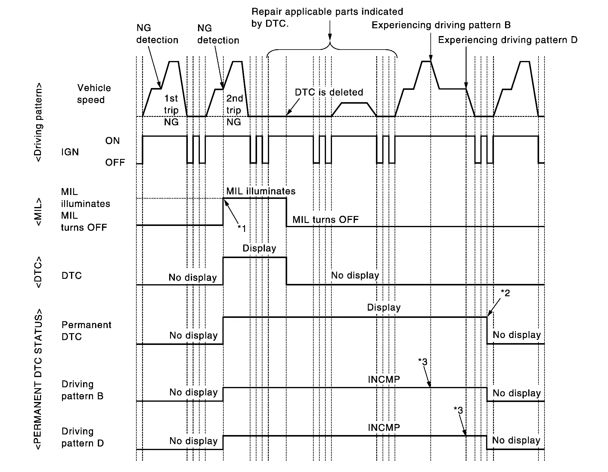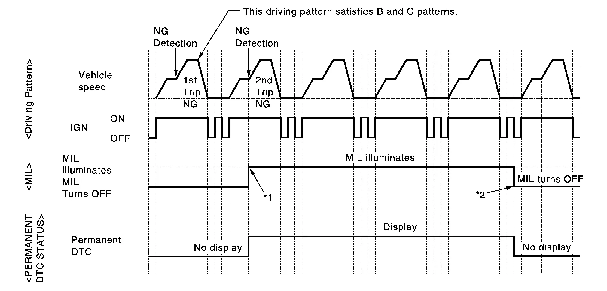 | *1: | When the same malfunction is detected in two consecutive trips, MIL will illuminate. | *2: | After experiencing driving pattern B and D, permanent DTC is erased. | *3: | Indication does not change unless the ignition switch is turned from ON to OFF twice even after experiencing driving pattern B or D. |