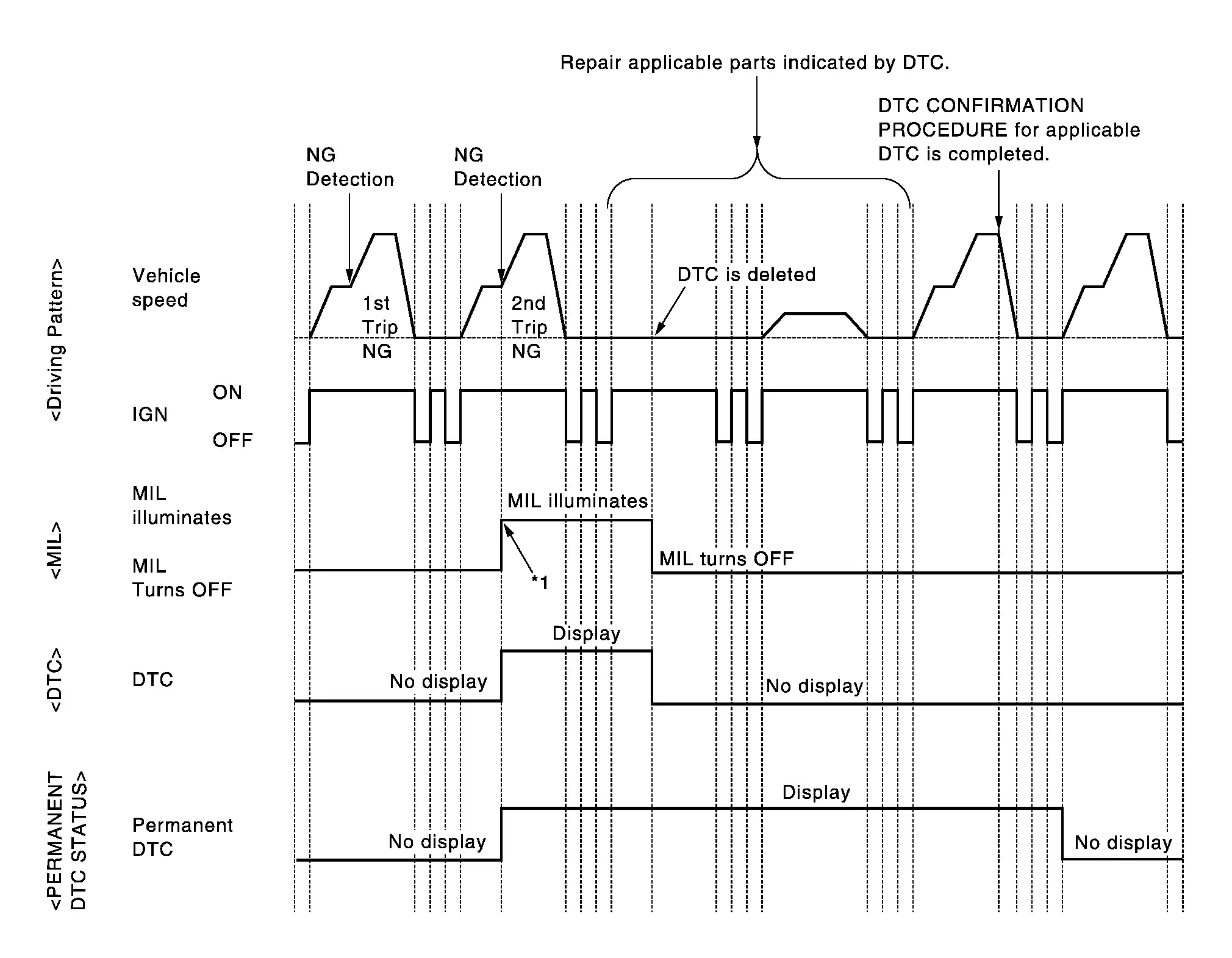 | *1: | When the same malfunction is detected in two consecutive trips, MIL will illuminate. |