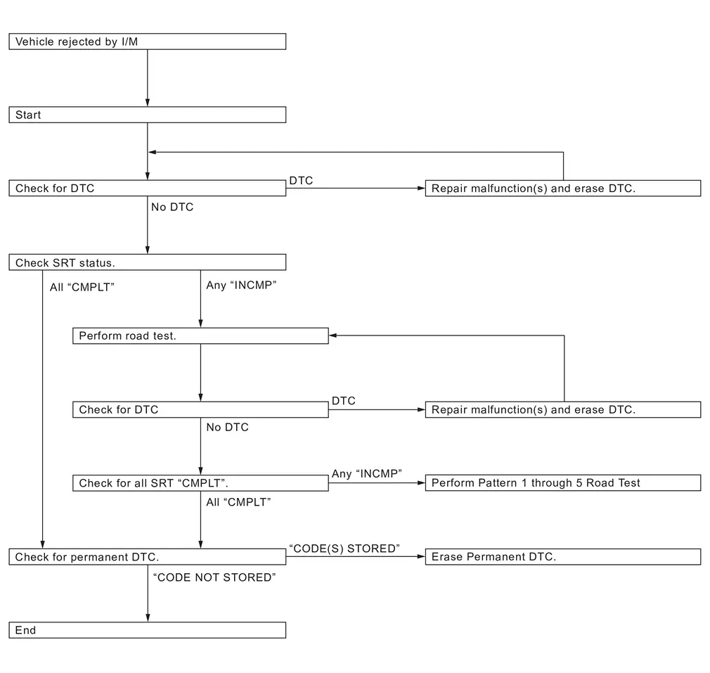 If a vehicle has failed the state emissions inspection due to one or more SRT items indicating “INCMP”, review the flowchart diagnostic sequence, referring to the following flowchart.