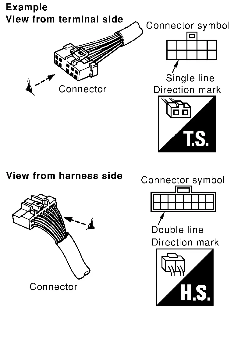 Connector symbols shown from the harness side are enclosed by a double line and followed by the direction mark.