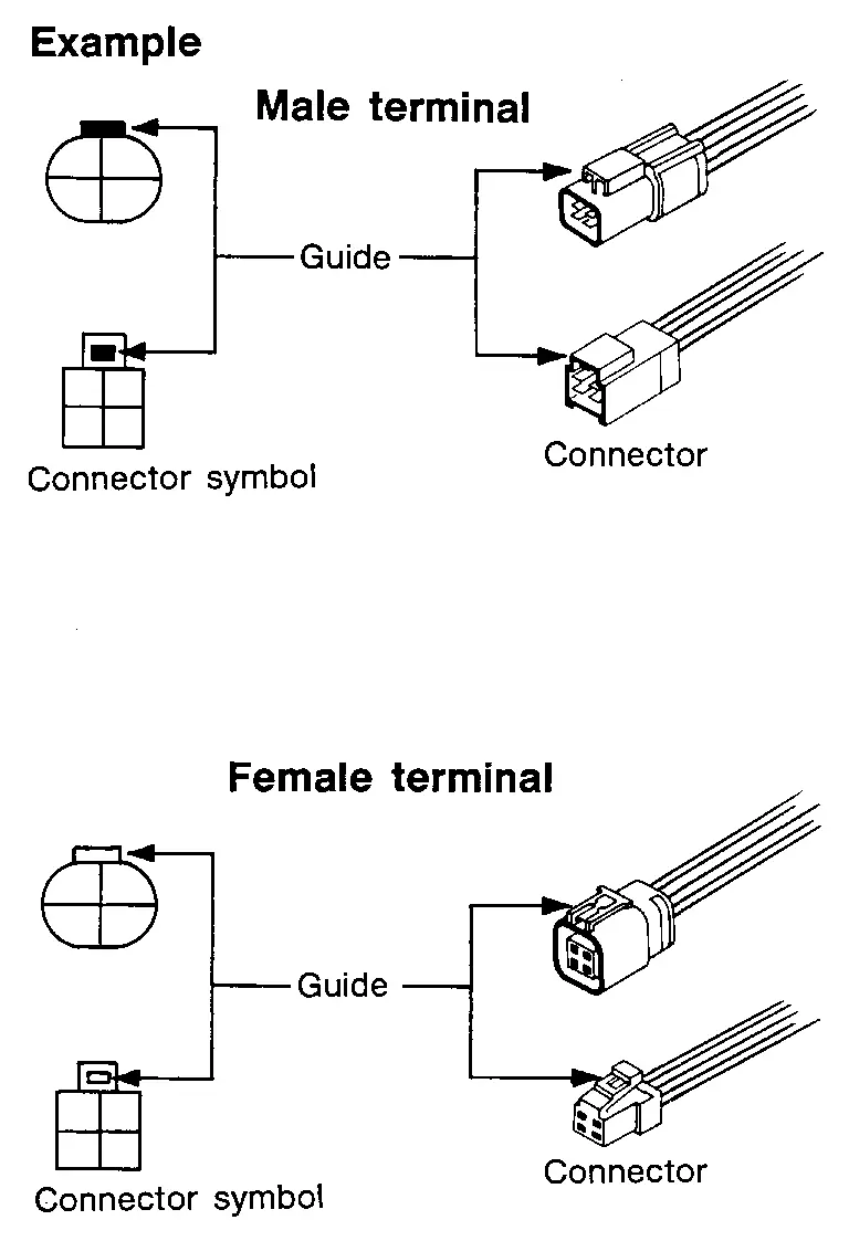 Connector guides for male terminals are shown in black and female terminals in white in wiring diagrams.