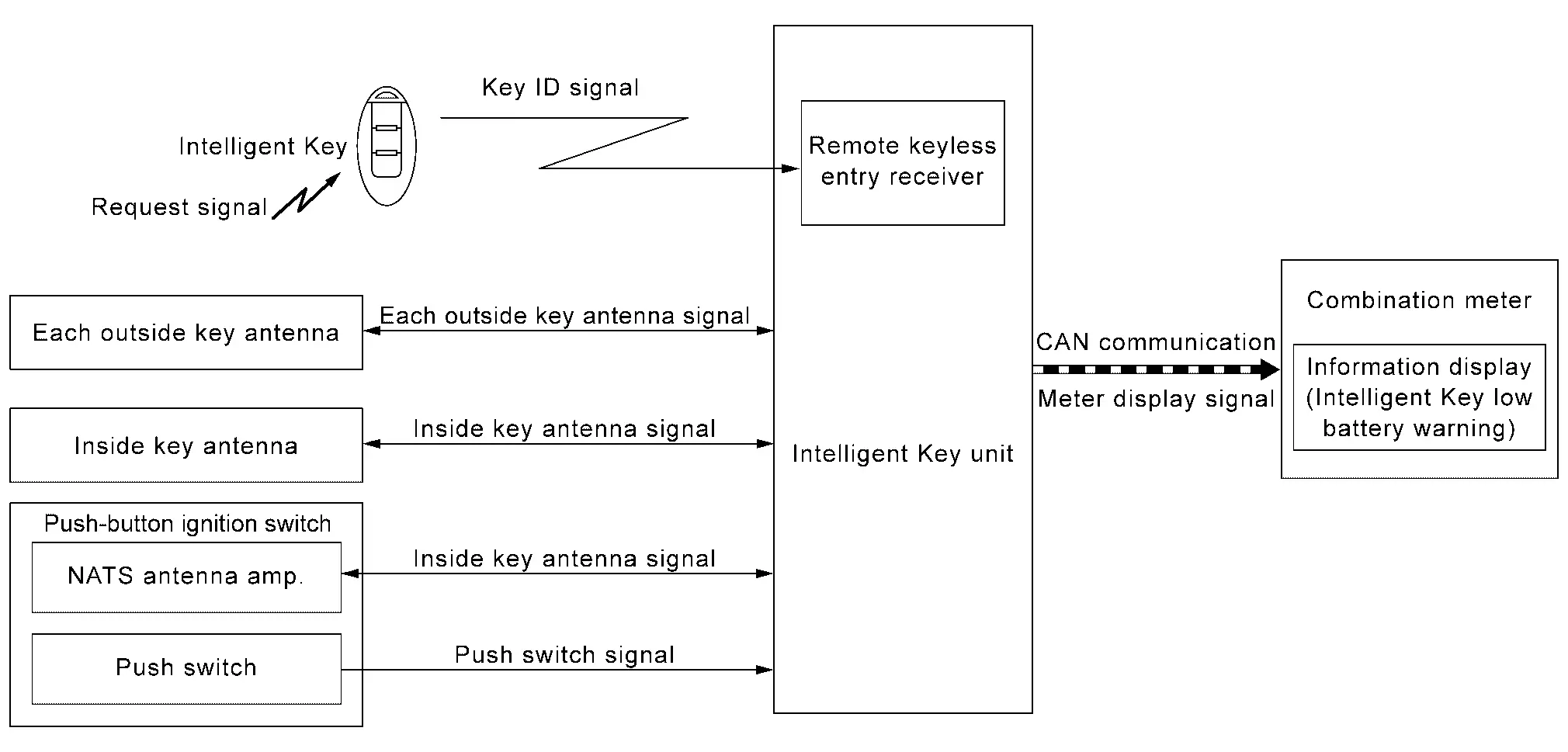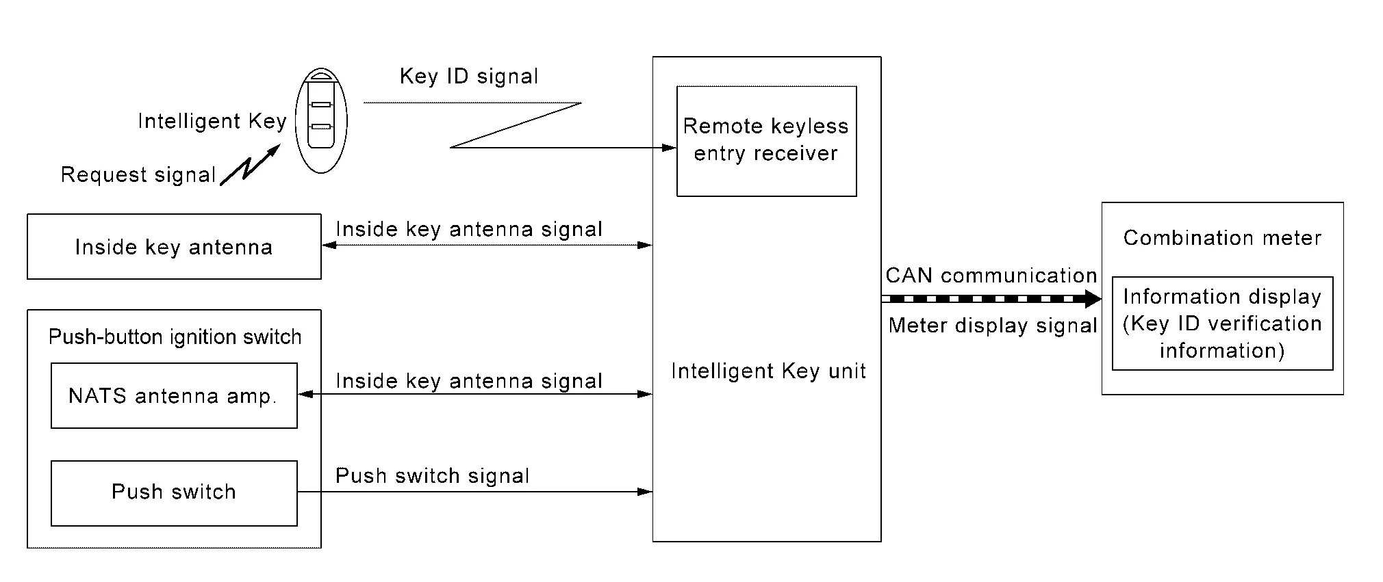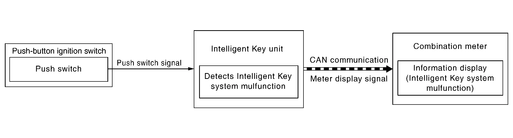 When Intelligent Key unit detects that Intelligent Key system malfunctions or that the engine cannot be started, meter display signal is transmitted by Intelligent Key unit to combination meter via CAN communication.