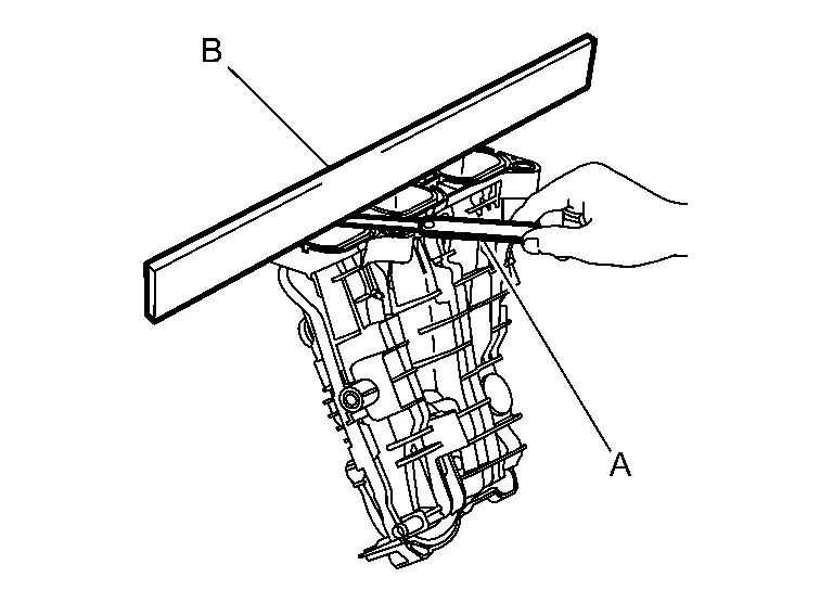 Check the surface distortion of the intake manifold mating surfacewith a straightedge (B) and a feeler gauge (A).