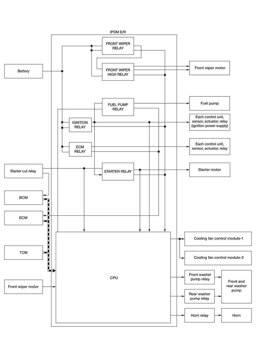 | IPDM E/R | IPDM E/R has the signal transmission function that transmits each input signal to each unit. |