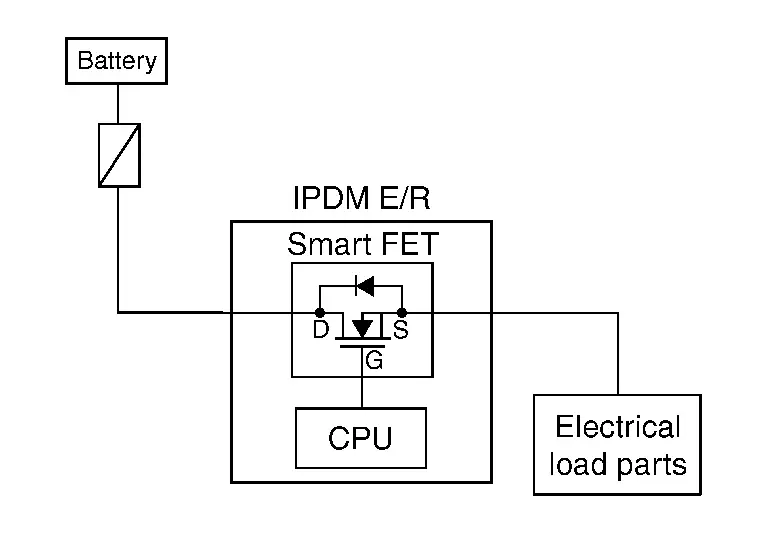 A Smart Field-Effect Transistor (FET) is a transistor used to monitor and control current flow on module outputs. The IPDM E/R uses a Smart FET protection strategy to prevent module damage in the event of excessive current flow. The Smart FET protection strategy monitors its outputs for excessive current, and when a fault occurs, shuts down the output and records a DTC.