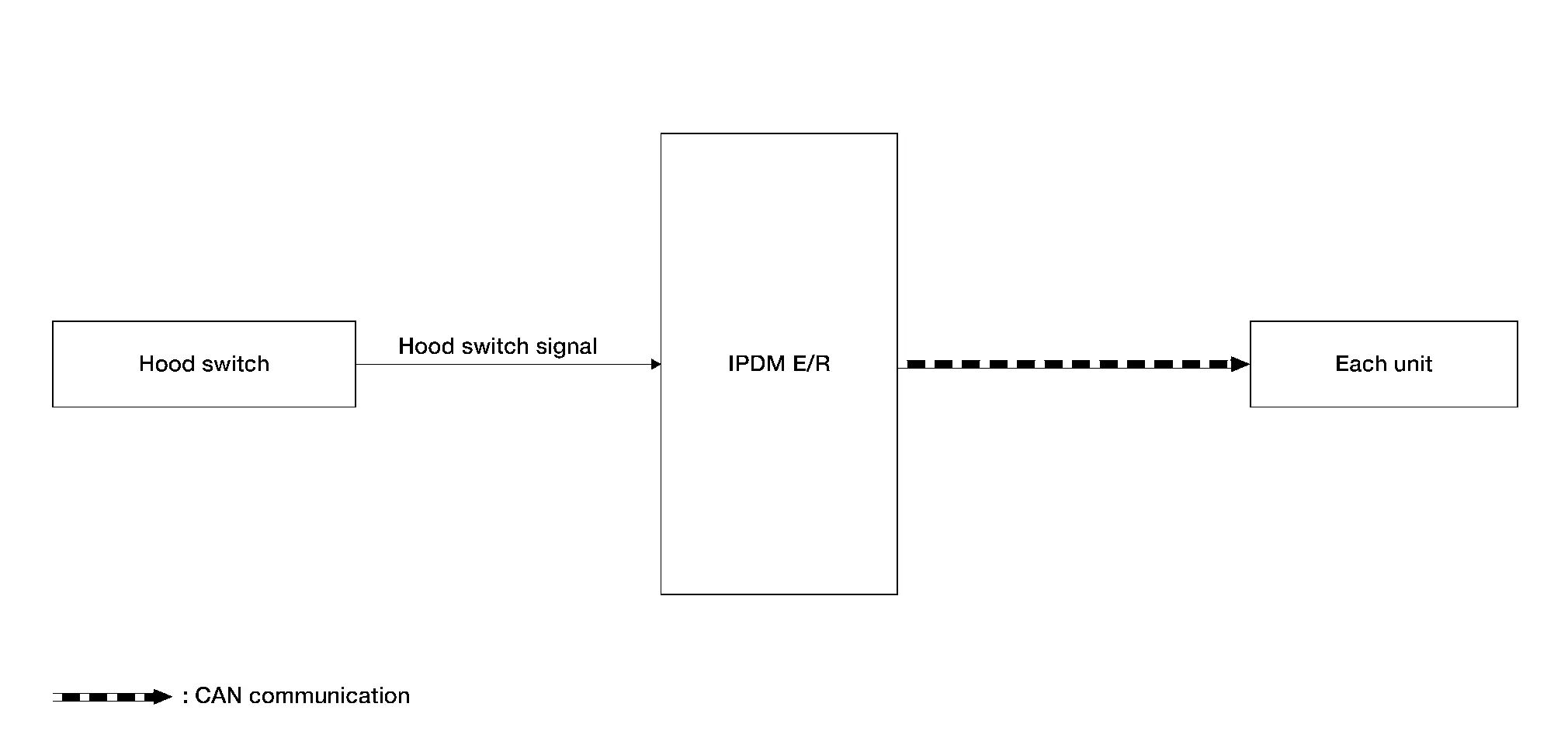 | Hood switch signal | Hood switch | BCM | Inputs the hood switch signal and transmits the hood switch signal via CAN communication. |