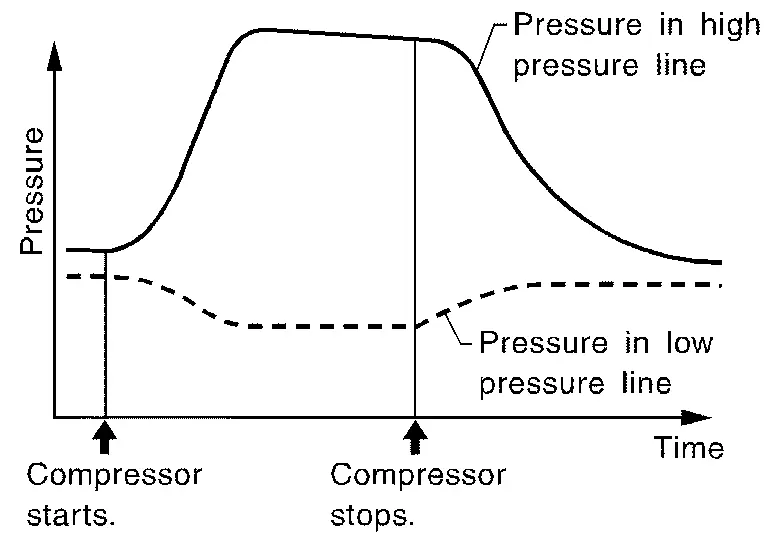 When refrigerant circulation is stopped, pressure on the low-pressure side rises gradually, and after this, pressure on the high-pressure side falls gradually.
