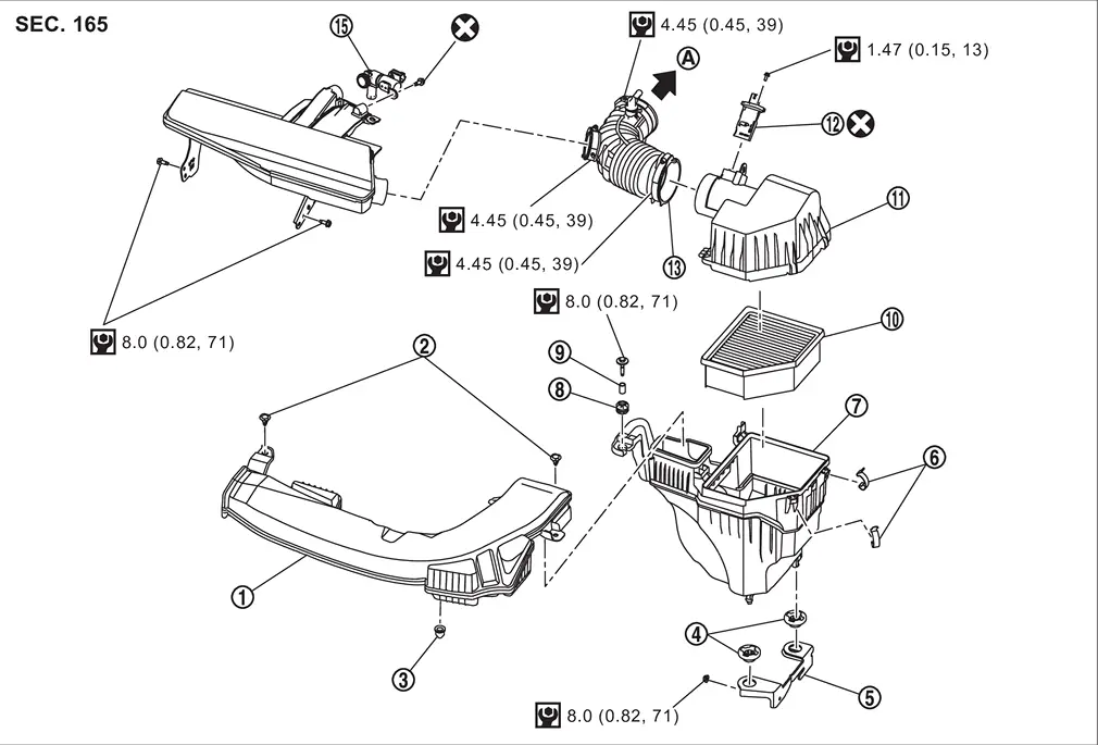 | 10. | Air cleaner filter | 11. | Air cleaner cover | 12. | Mass air flow sensor |