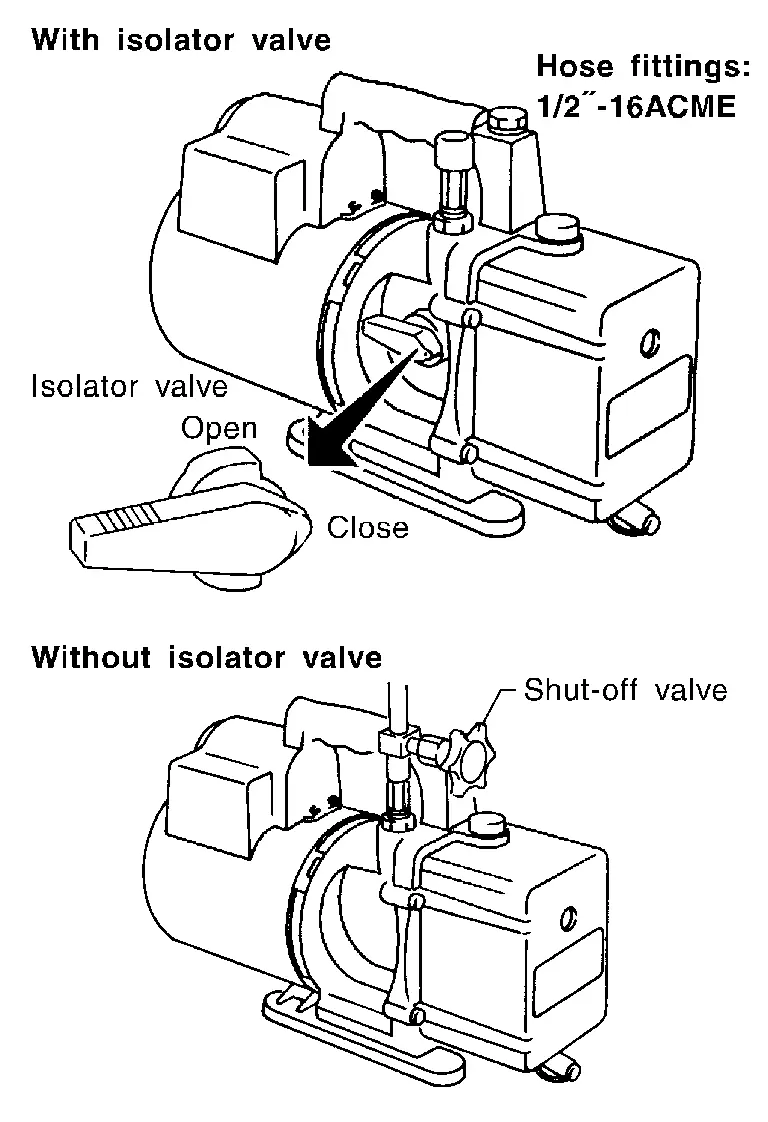 Vacuum pumps usually have a manual isolator valve as part of the pump. Close this valve to isolate the service hose from the pump.
