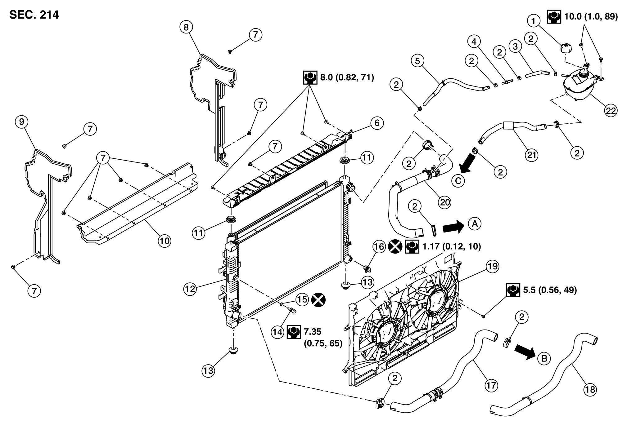 Use genuine mounting bolts for the cooling fan assembly and strictly observe the tightening torque. (Breakage prevention for radiator)