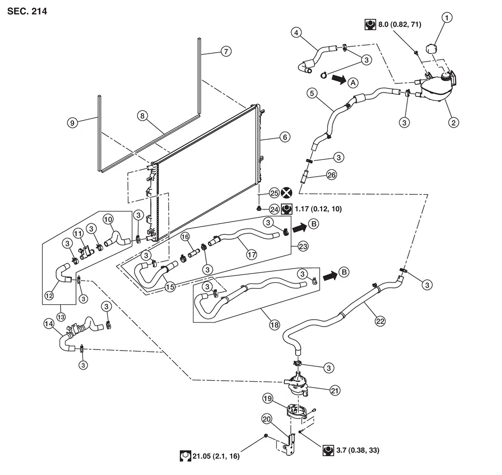 | 19. | Cooling fan assembly | 20. | Radiator hose (upper) | 21. | Reservoir tank hose |