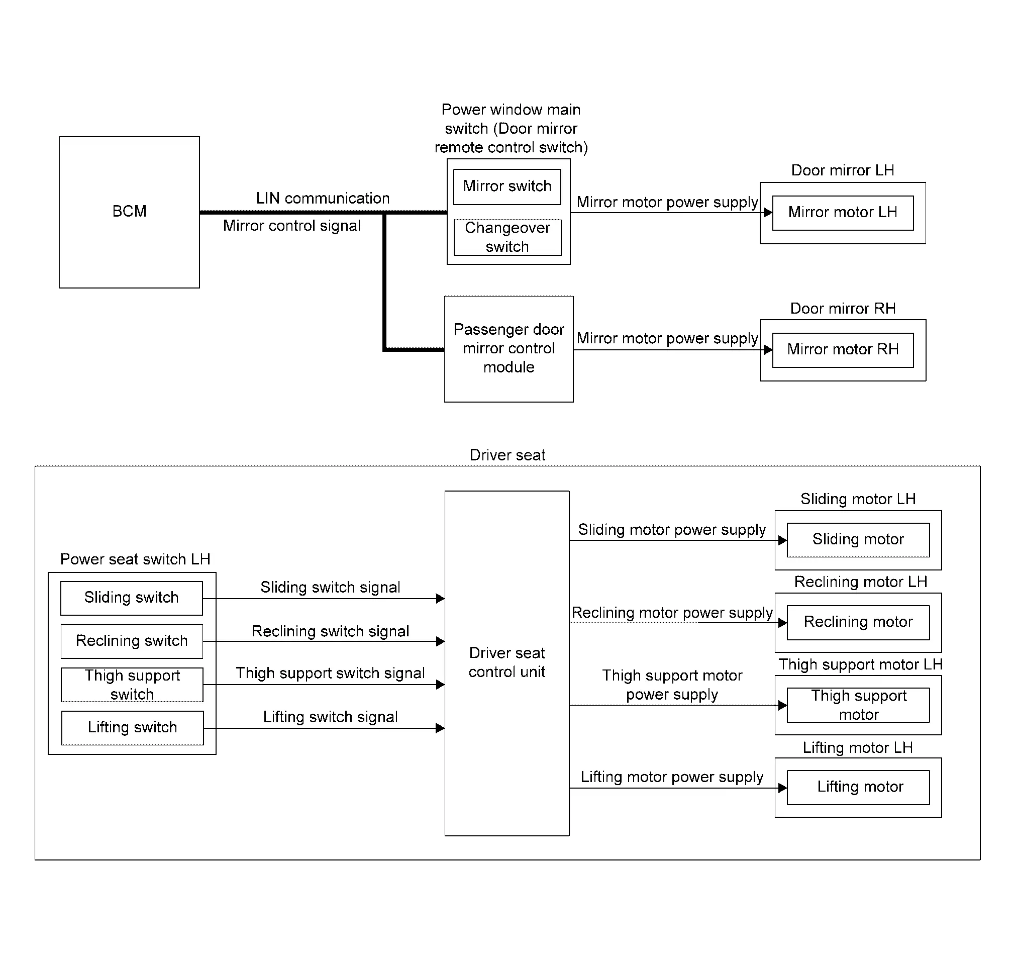 The BCM transmits mirror control signal to power window main switch and passenger door mirror control module via LIN communication and actuates each motor according to the operation of the door mirror remote control switch. |