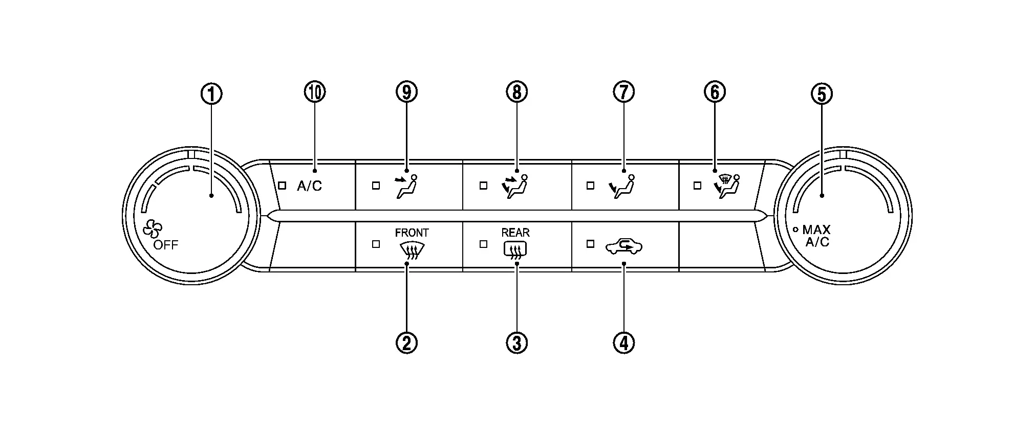 | 1. | Fan control dial | 2. | DEF switch | 3. | Rear window defogger switch |