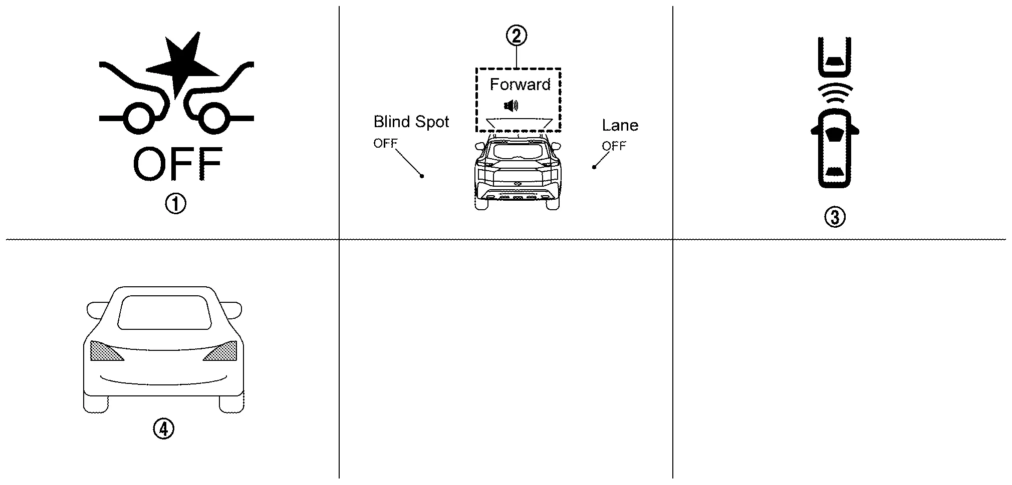 | RCTA ON | Shift lever is in any position other than reverse | — | OFF | — | OFF | ||