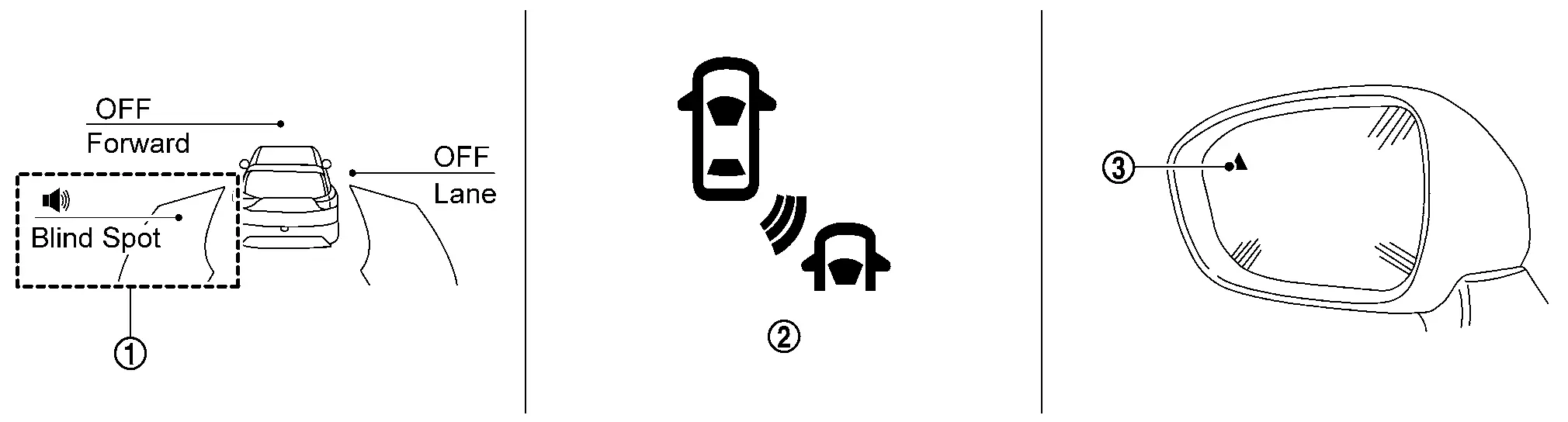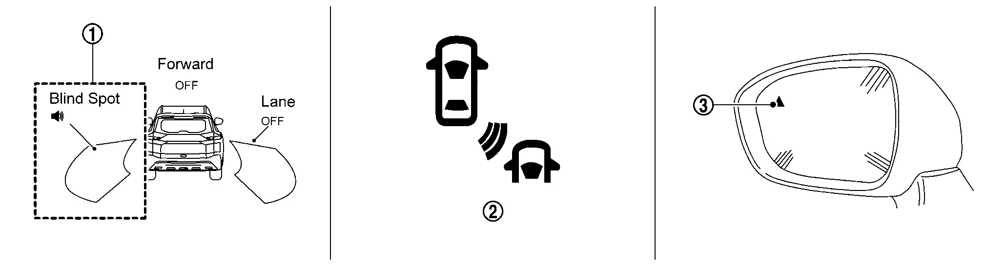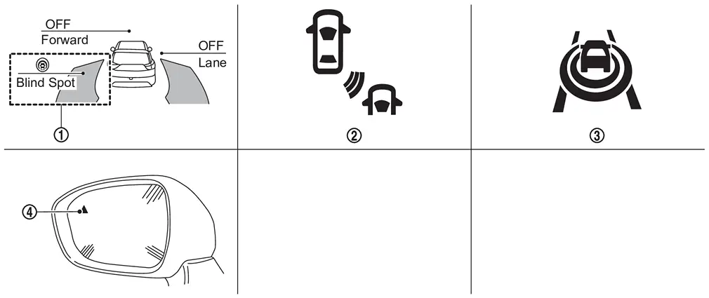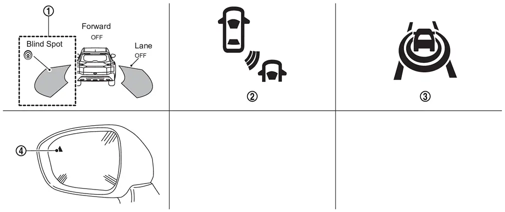Blind Spot Warning/I-BSI indicator LH/RH | Illuminates when detect other Nissan Ariya vehicles beside vehicle in an adjacent lane |