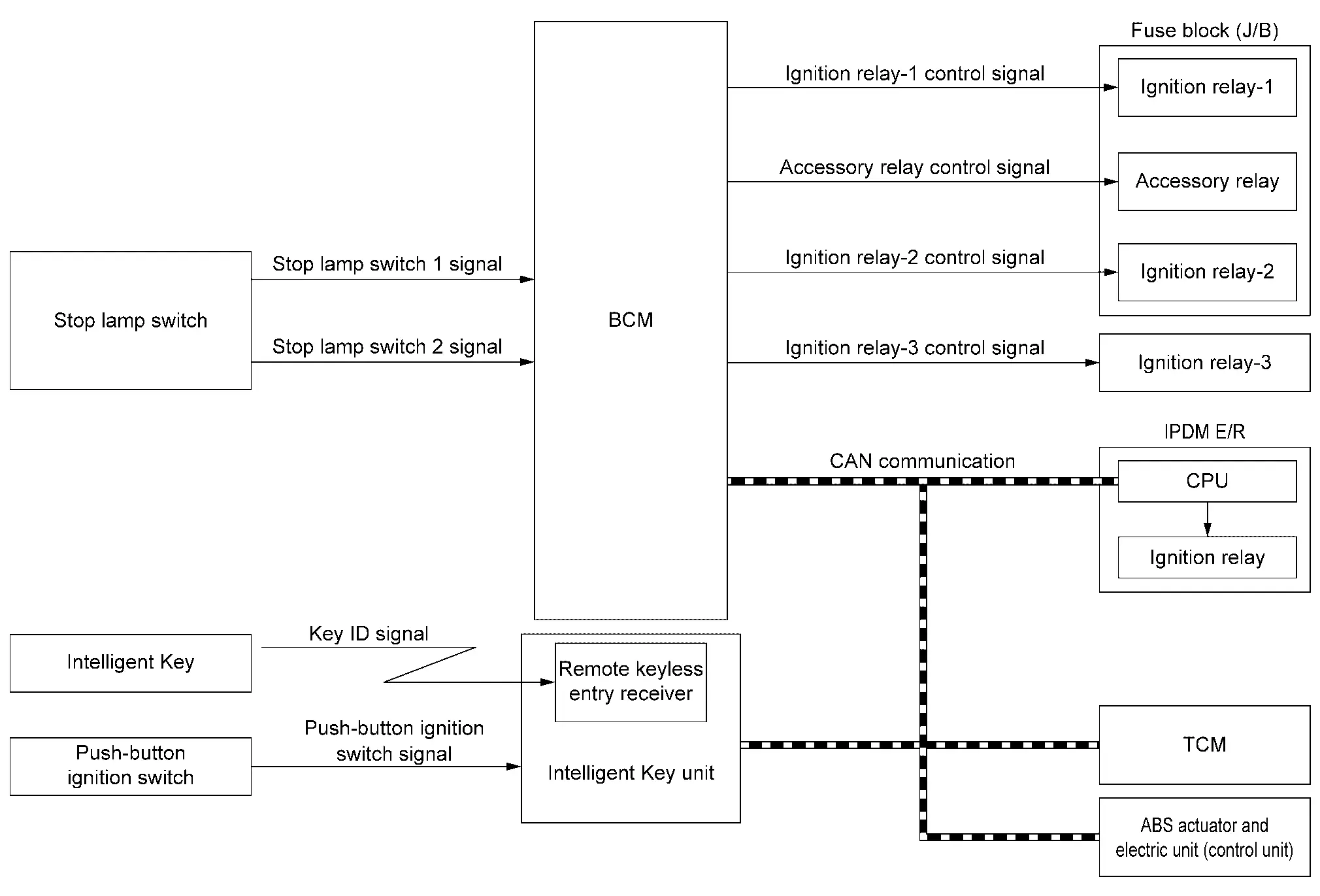 | Intelligent Key unit | Transmits push-button ignition switch status signal to BCM via CAN communication. |