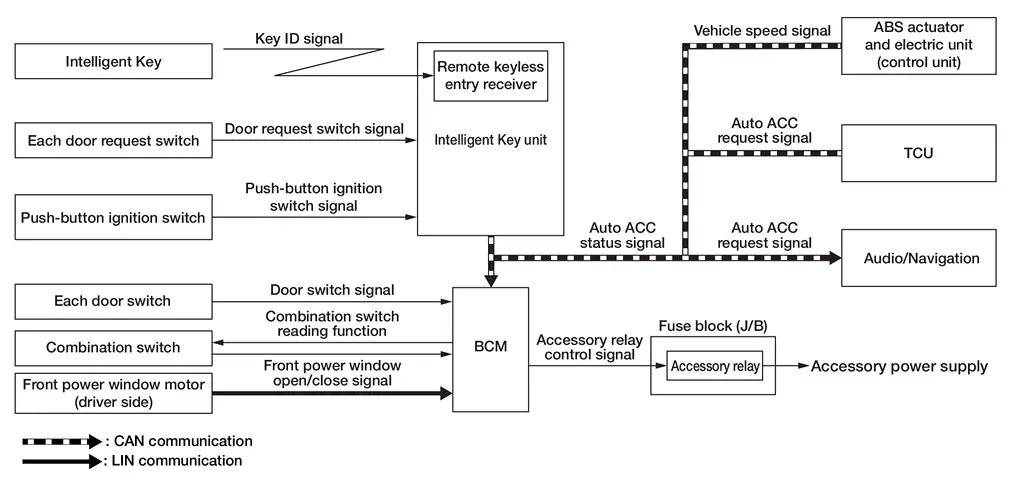 | Intelligent Key unit | Transmits the push-button ignition switch status signal and door lock/unlock request signal to the BCM via CAN communication. |