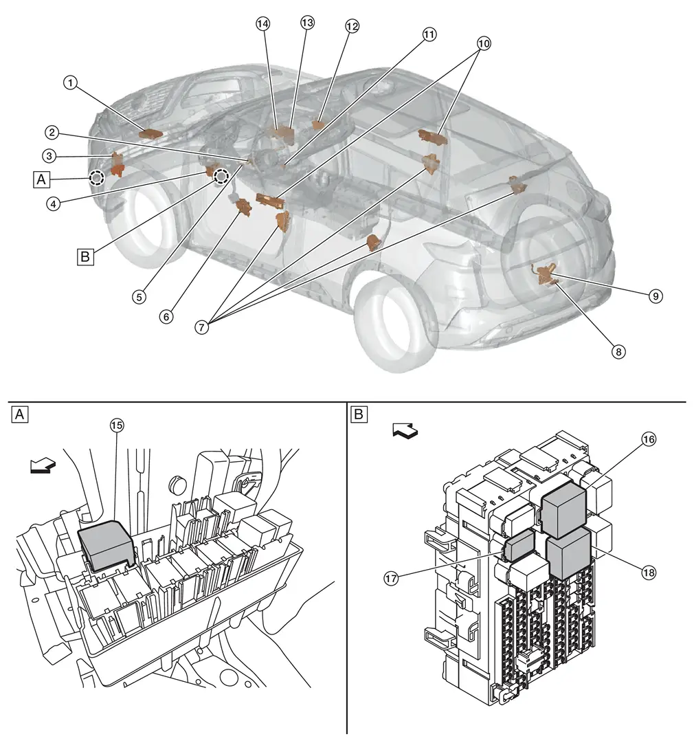 | ABS actuator and electric unit (control unit) | Transmits Nissan Ariya vehicle speed signal to BCM via CAN communication. |