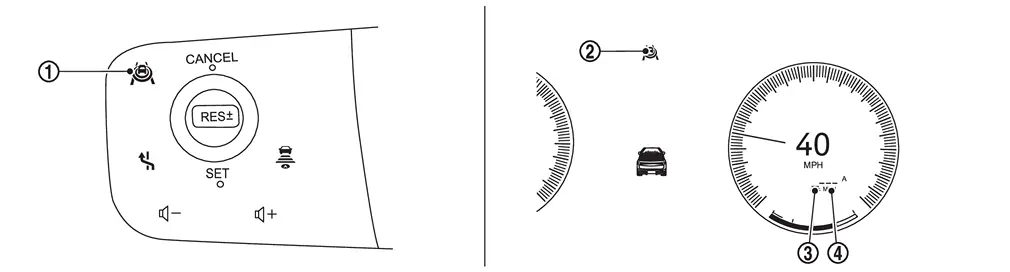 The control is automatically canceled when the driving Nissan Ariya vehicle speed drops below 25 km/h (16 MPH) approximately without detecting the vehicle ahead.