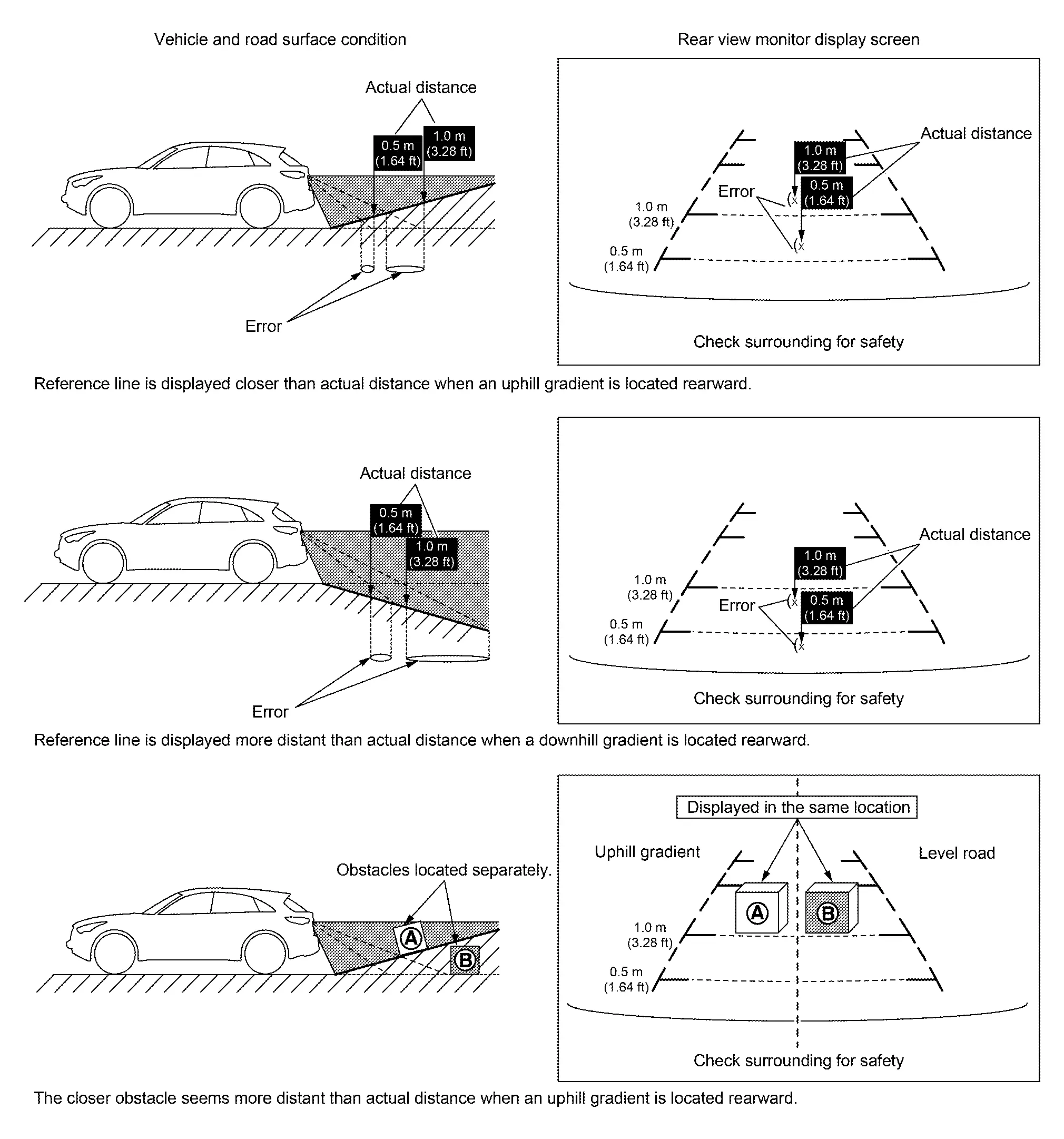 Since vehicle width guide lines and predicted course lines are drawn based on the road, a different distance may be displayed if uphill or downhill gradient is present nearby.