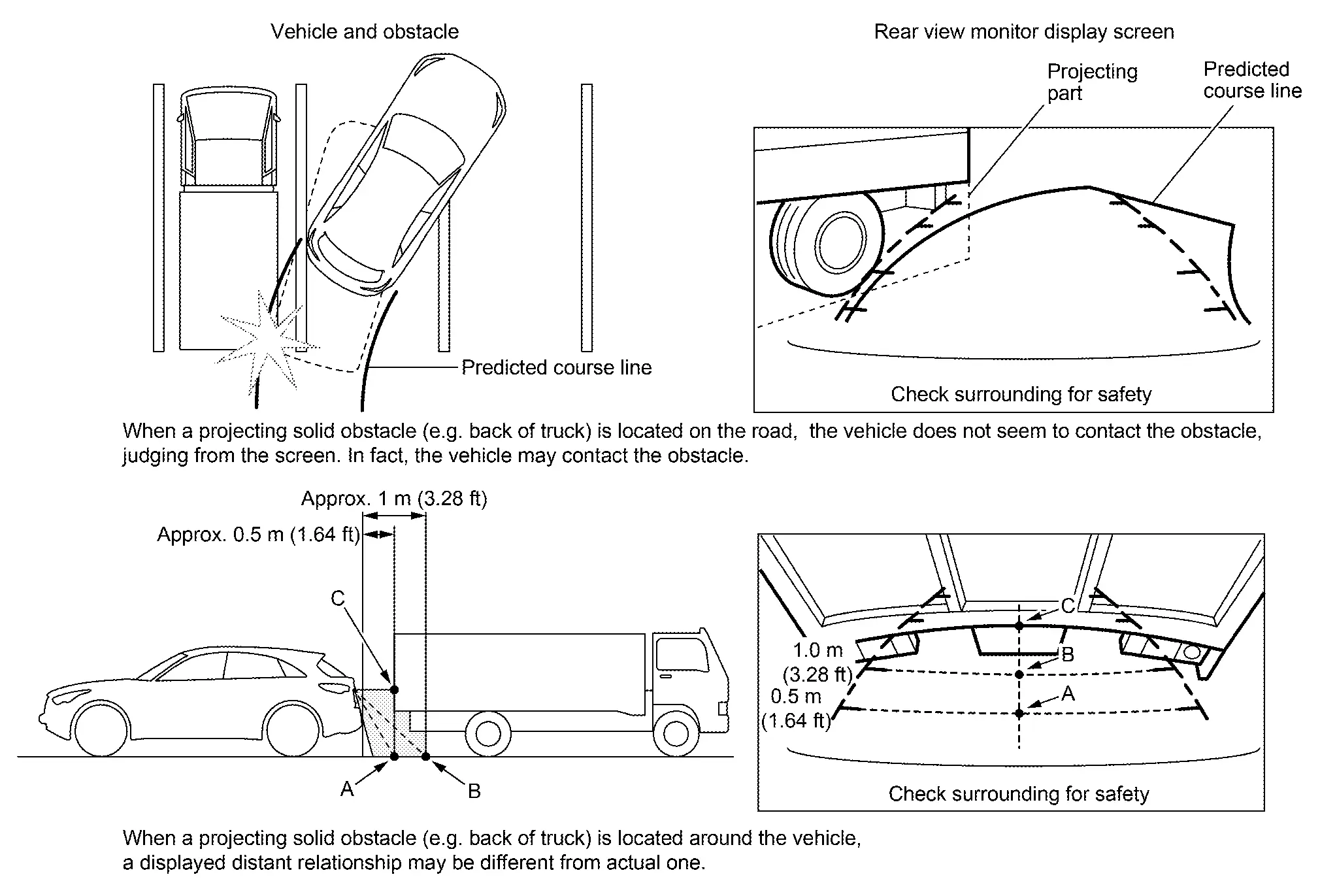 Since vehicle width guide lines and predicted course lines are drawn based on the road, a different distance may be displayed if a projecting obstacle is present nearby.