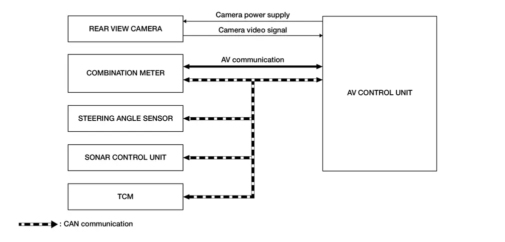 Power for the camera is supplied from the AV control unit, and the image at the rear of the Nissan Ariya vehicle is sent to the AV control unit display.