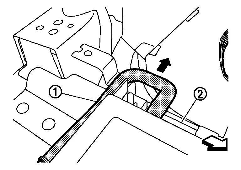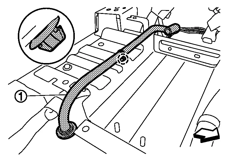 Disengage sub battery tube clip, and then remove sub battery tube (1) from floor panel.
