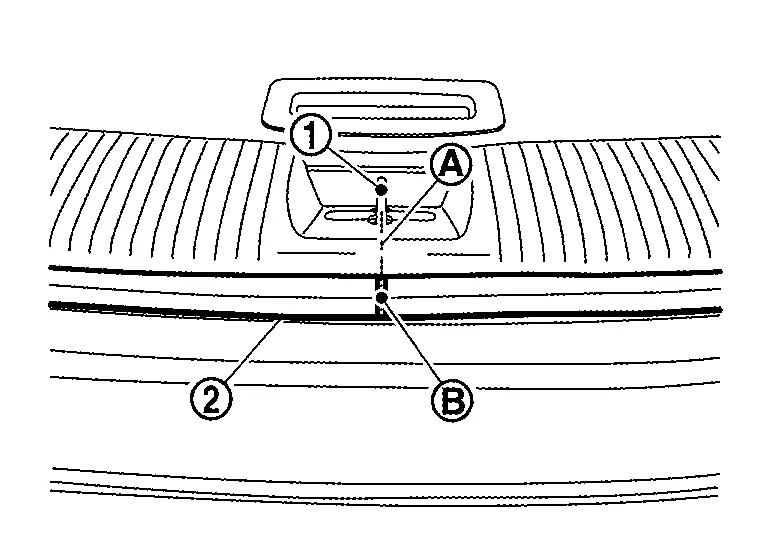 Align the seam (B) of back door weather-strip (2) with the center (A) of back door striker (1), and then install weather-strip onto the Nissan Ariya vehicle.