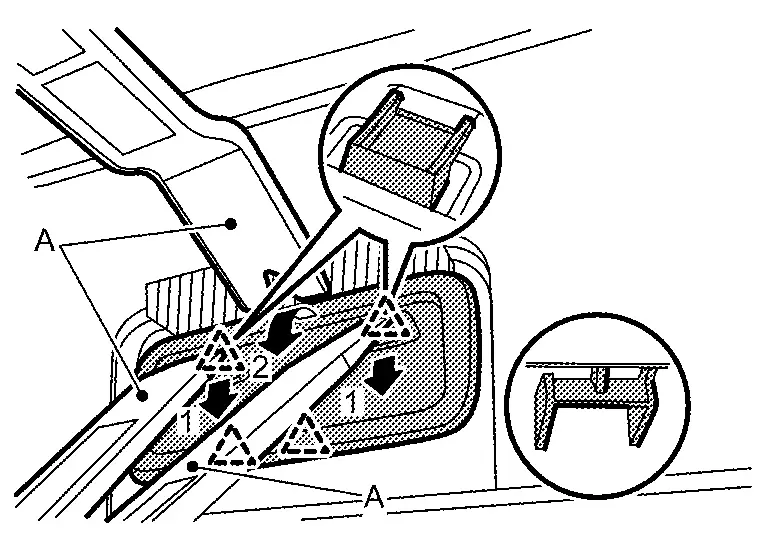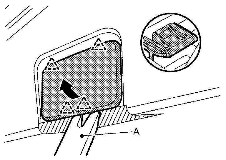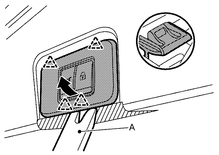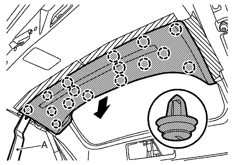 Disengage back door finisher cap fixing pawls using a remover tool (A), and then remove back door finisher cap.
