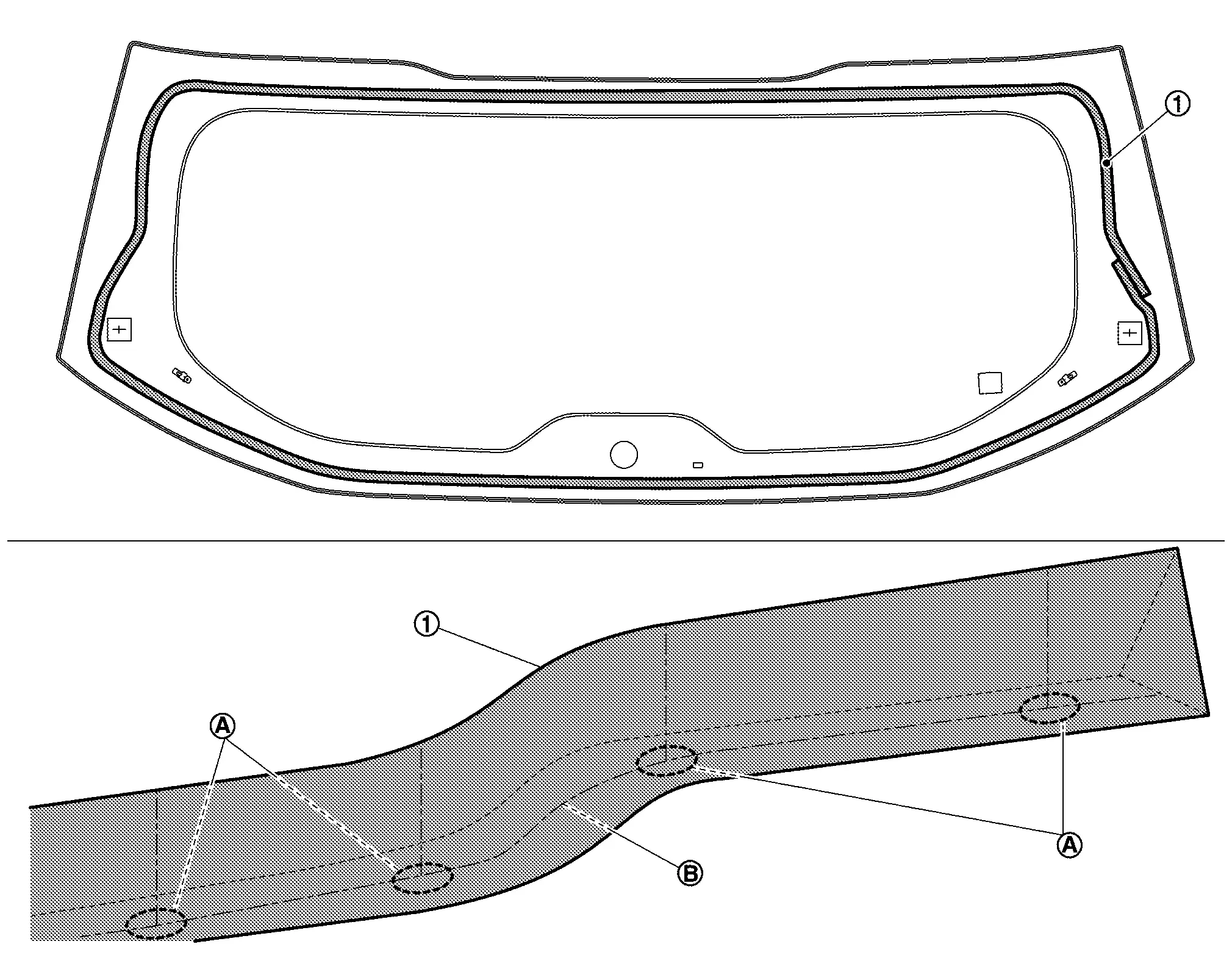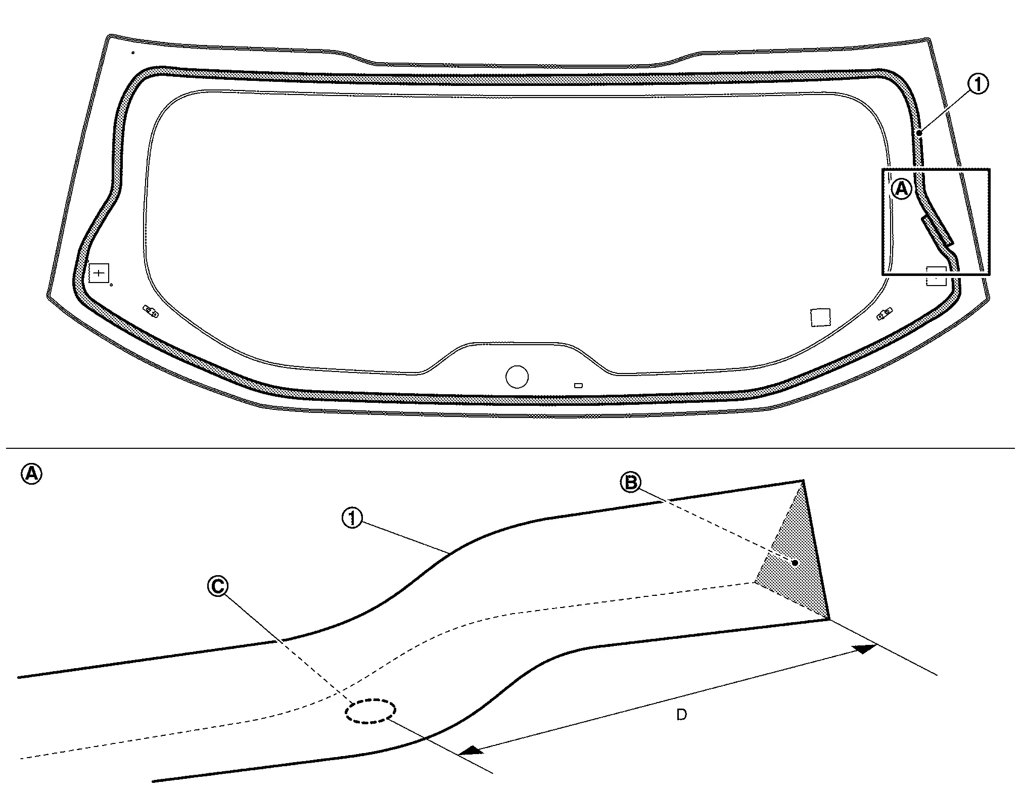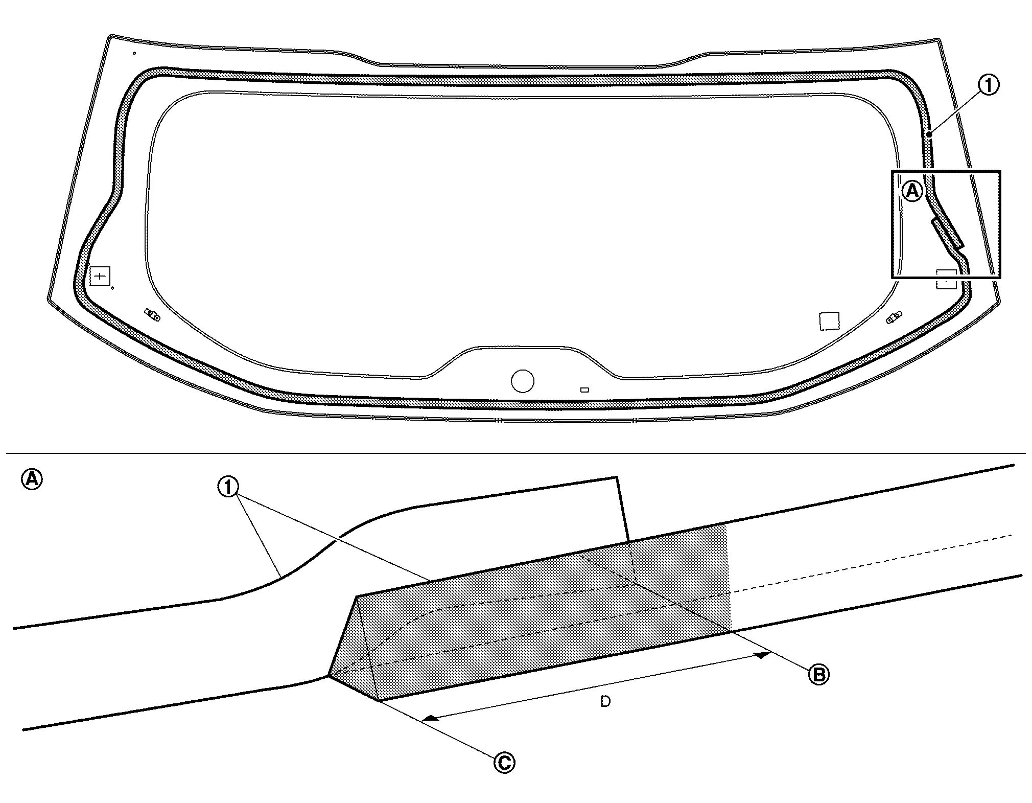 Apply glass primer along the entire circumference of back door window glass. The range of glass primer, refer to Exploded View.