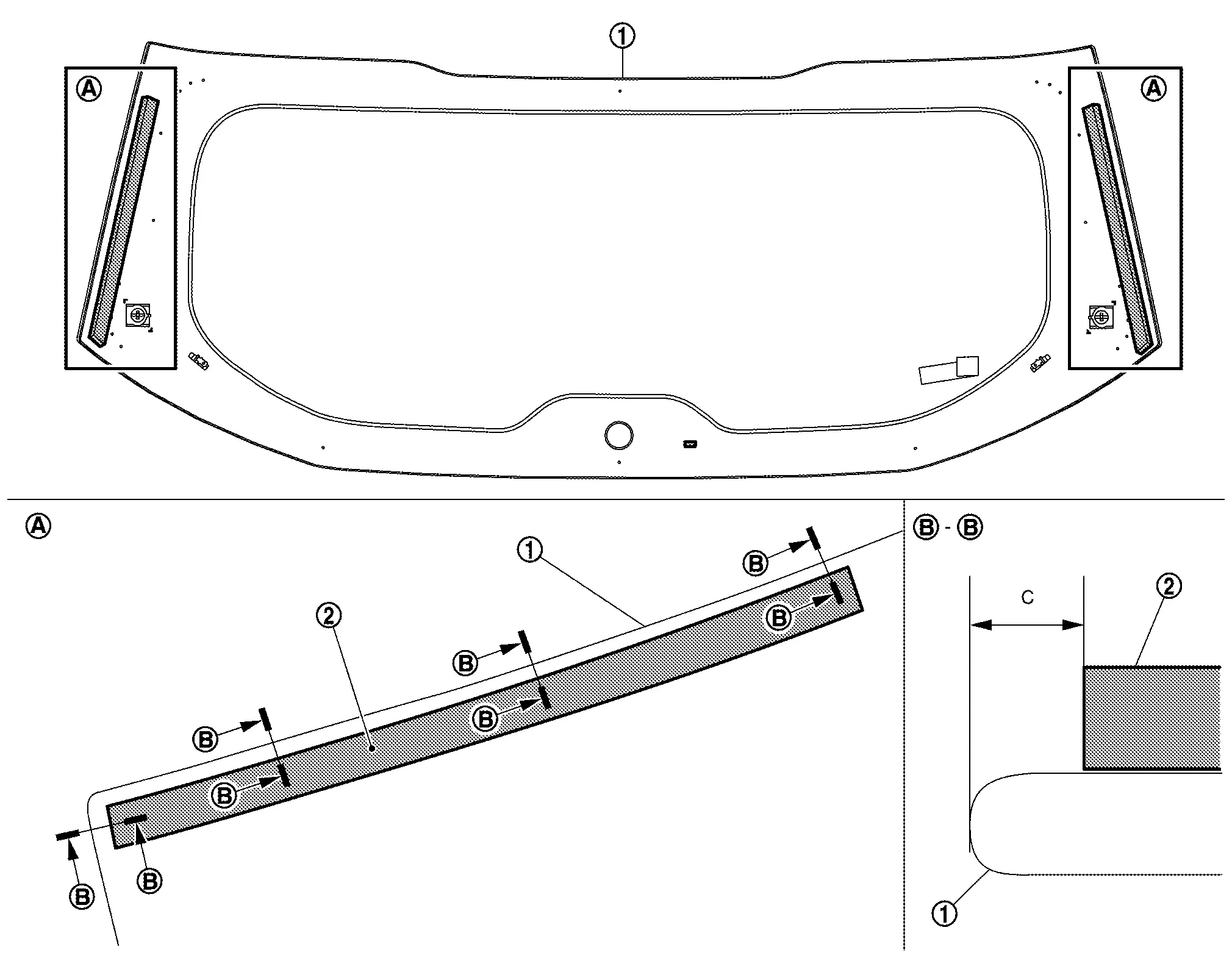 Use a cutter knife or scraper, and leave the of adhesive on the back door side approximately 2 mm (0.079 in) (A) to make adhesive surface smooth.