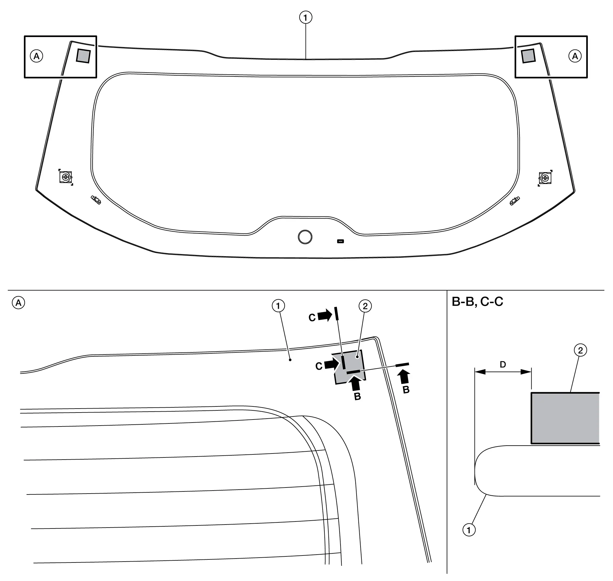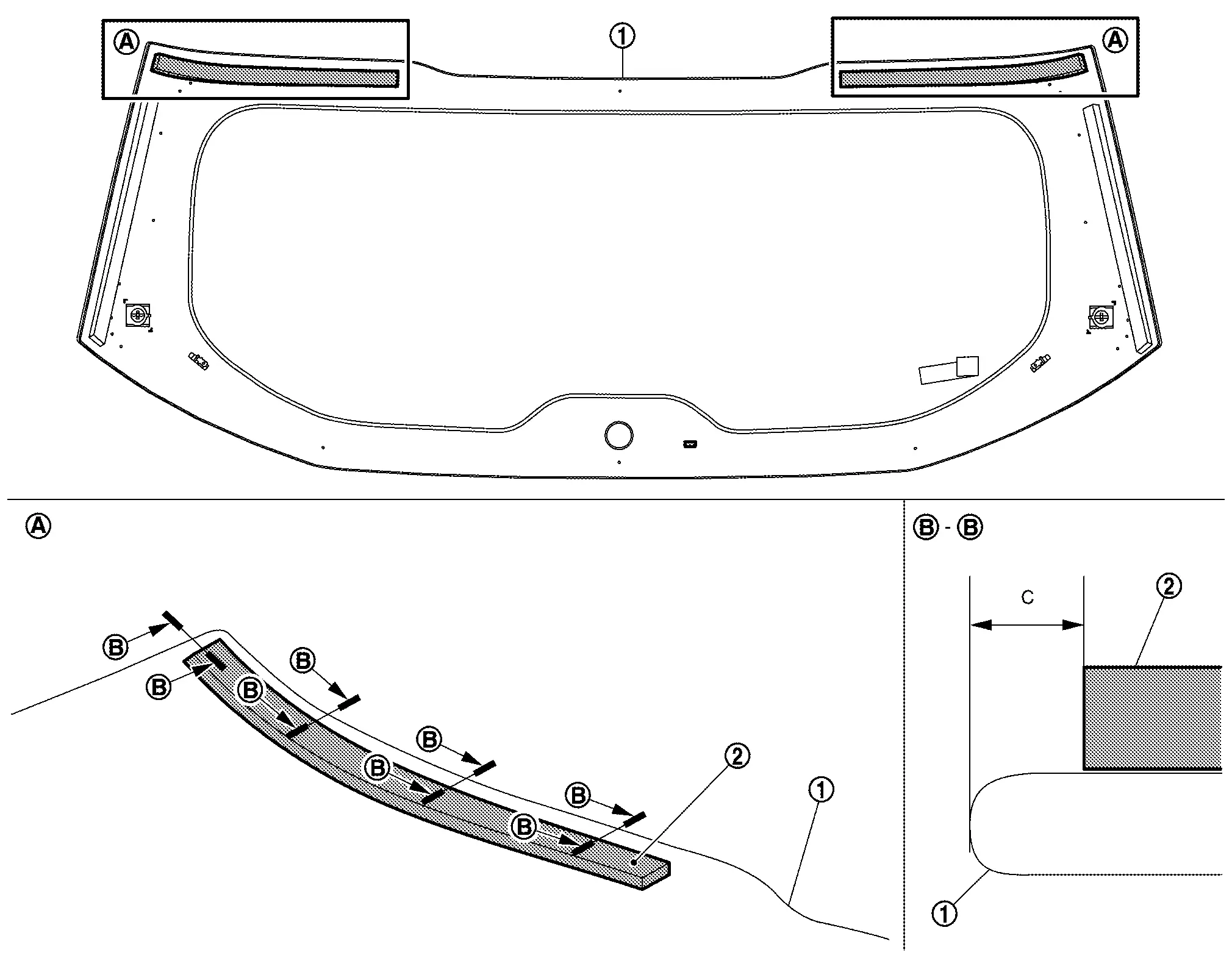 Install clip.Clean back door window glass to install position of clip by using white gasoline or degreasing agent. Apply glass primer on back door window of clip install positions. Remove release liner of double sided tape for installing clip. Install clip on back door window glass.