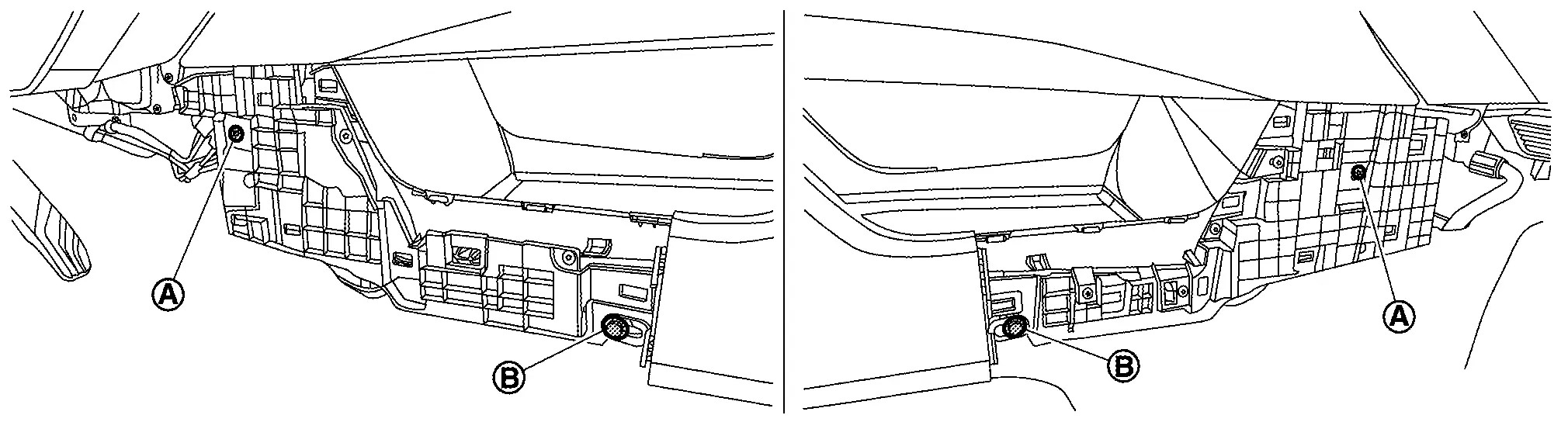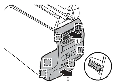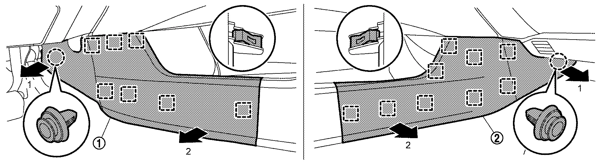 Disengage fixing clip and metal clips, and then remove instrument side panel (LH (1) and RH (2)) according to numerical order 1→2 indicated by arrows as shown in the figure.