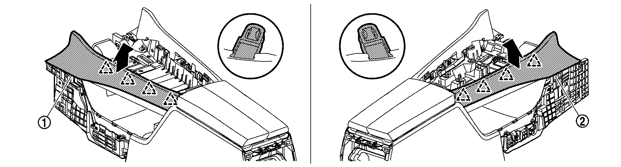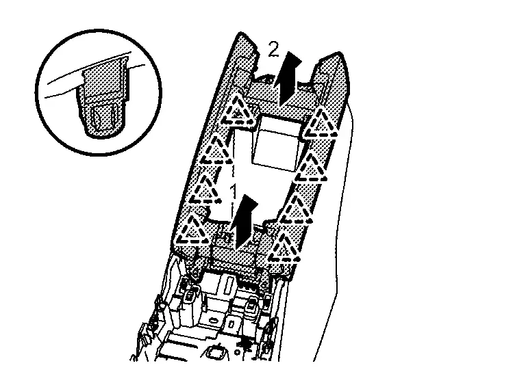 Remove console rear finisher.Open the console lid. Disengage fixing metal clips according to numerical order 1→2 indicated by arrows as shown in the figure, and then pull out console rear finisher.