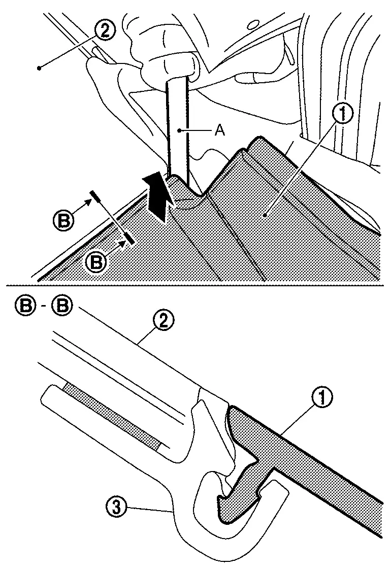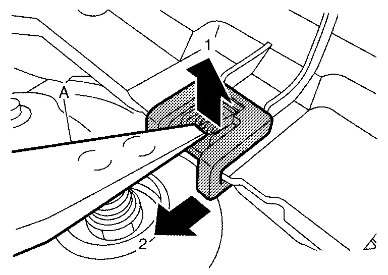 Remove cowl top grille clip using a remover tool (A) according to the numerical order 1→2 as shown by the arrows in the figure.