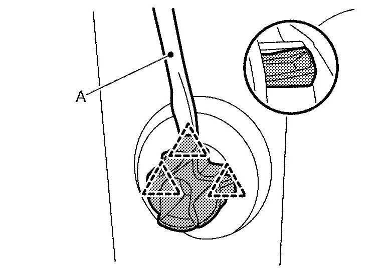 Disengage front drain connector fixing pawls using remover tool (A), push it into the Nissan Ariya vehicle interior.