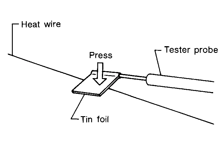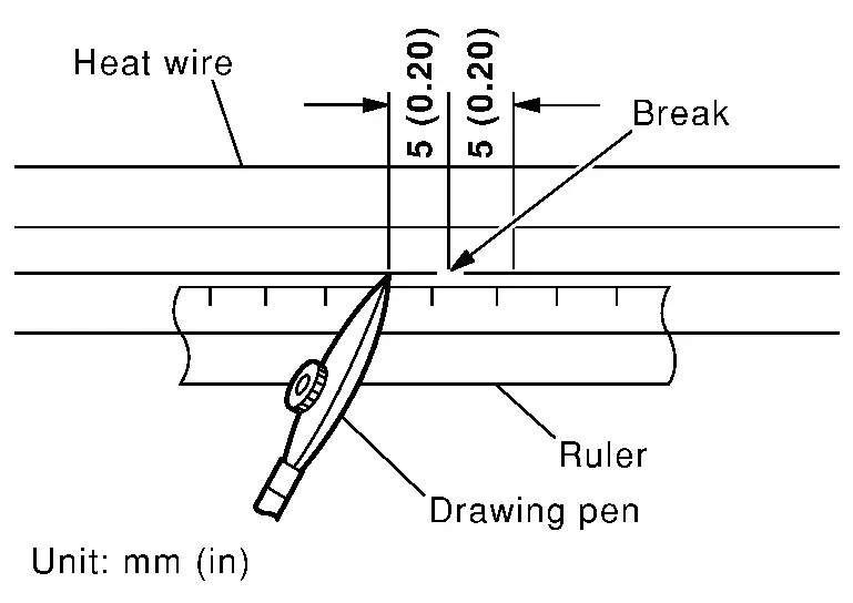 Place ruler on glass along broken line. Deposit conductive silver composition on break with drawing pen. Slightly overlap existing heat wire on both sides [preferably 5 mm (0.20 in)] of the break.