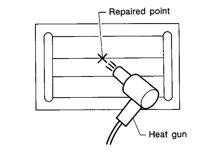 Apply a constant stream of hot air directly to the repaired area for approximately 20 minutes with a heat gun. A minimum distance of 3 cm (1.2 in) should be kept between repaired area and hot air outlet.