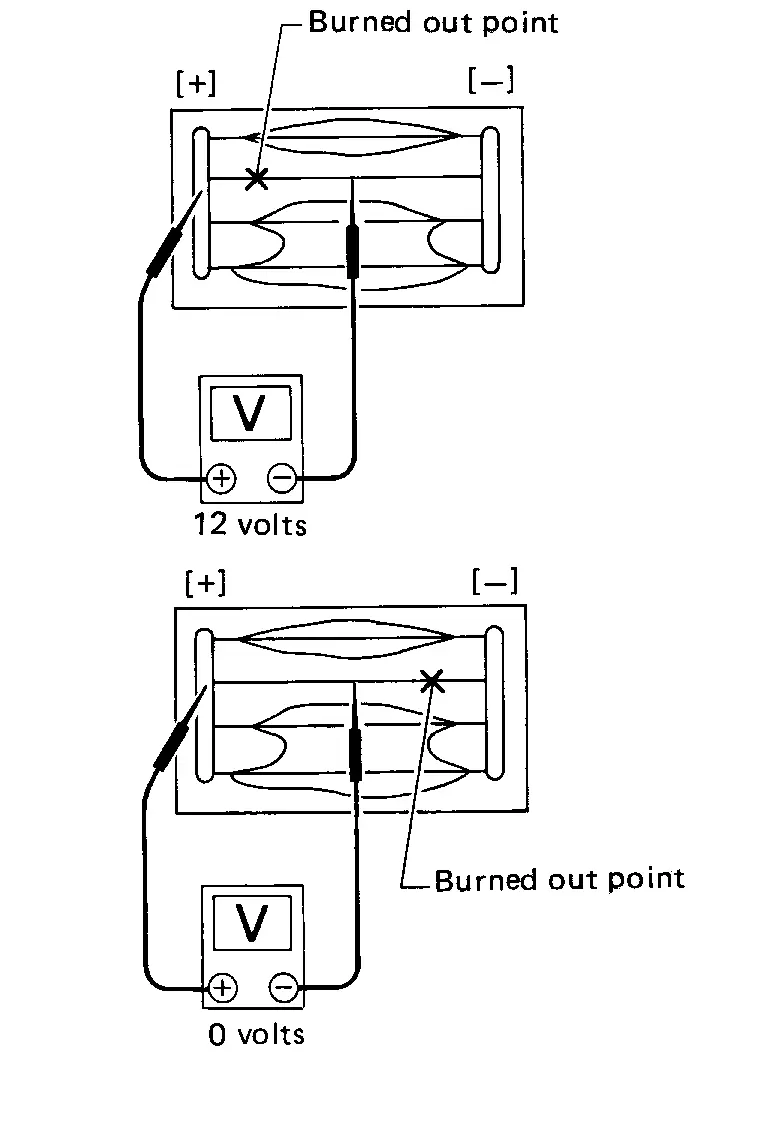 To locate burned out point, move probe to left and right along filament. Test needle will swing abruptly when probe passes the point.
