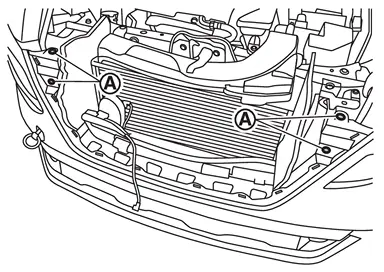 Remove front bumper fascia fixing screw (A) and bolts (B).