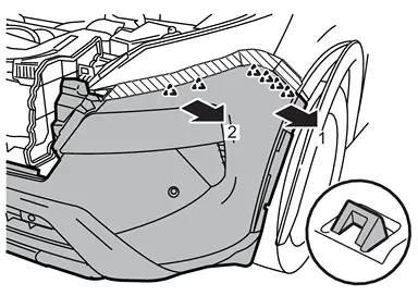 Pull front bumper fascia side toward the Nissan Ariya vehicle side to disengage the fitting of front bumper side bracket and front bumper fascia side according to the numerical order 1→2 as shown by the arrows in the figure.