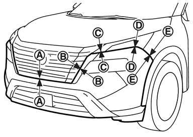 Front bumper fascia is made of resin. Never apply strong force to it, and be careful to prevent contact with oil.