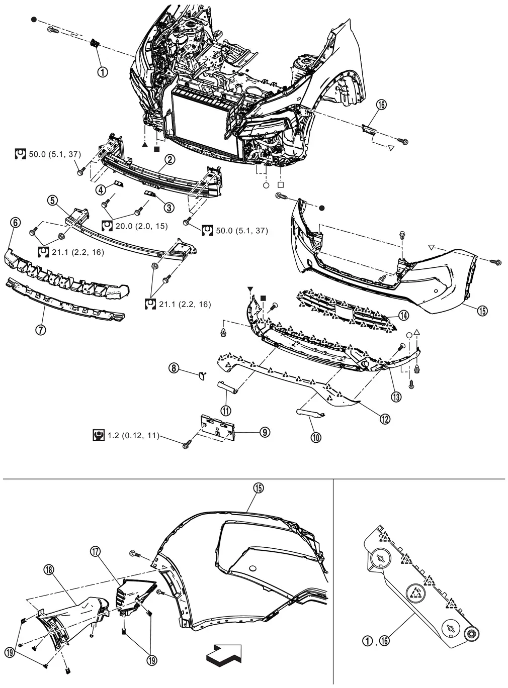 | 16. | Front bumper side bracket LH | 17. | Front bumper finisher | 18. | Front bumper bracket |