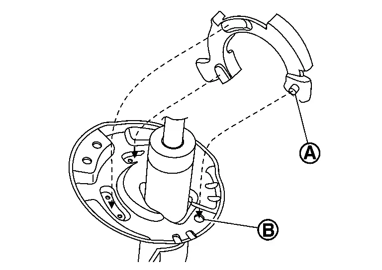 Remove strut mounting bolts from steering knuckle. Measure the gap (A) of the steering knuckle. And then mark the enlarged limit (B) to the chisel.