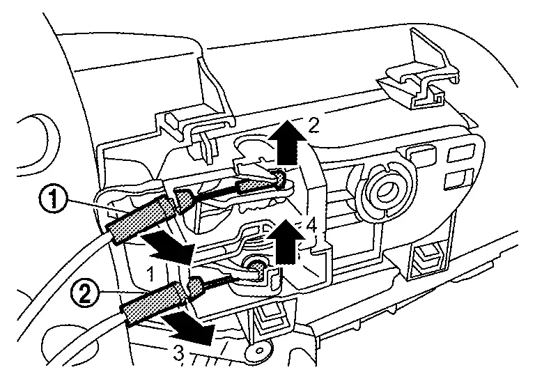 Disconnect lock knob cable (1) and inside handle cable (2) from inside handle according to numerical order 1→4 indicated by arrows as shown in the figure.