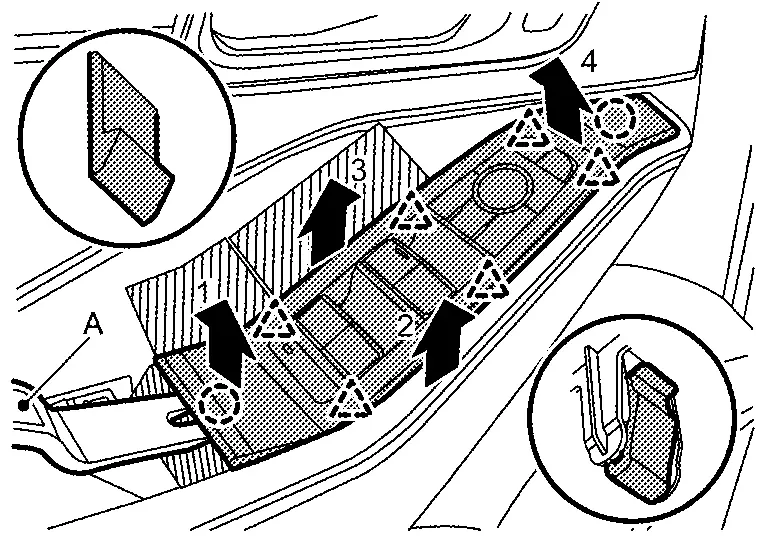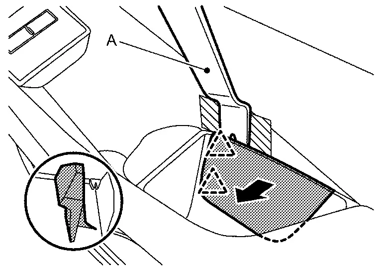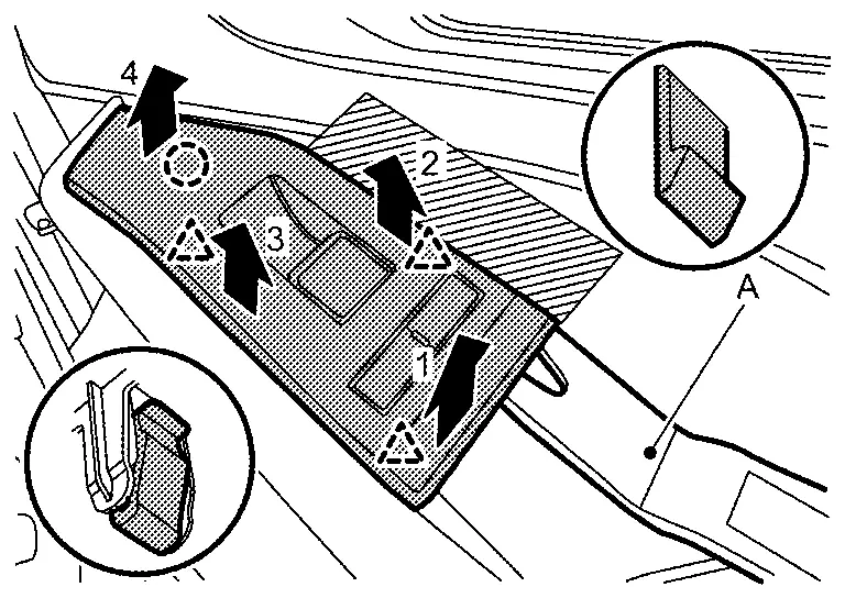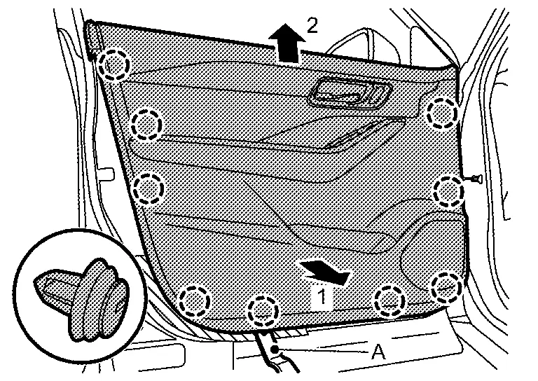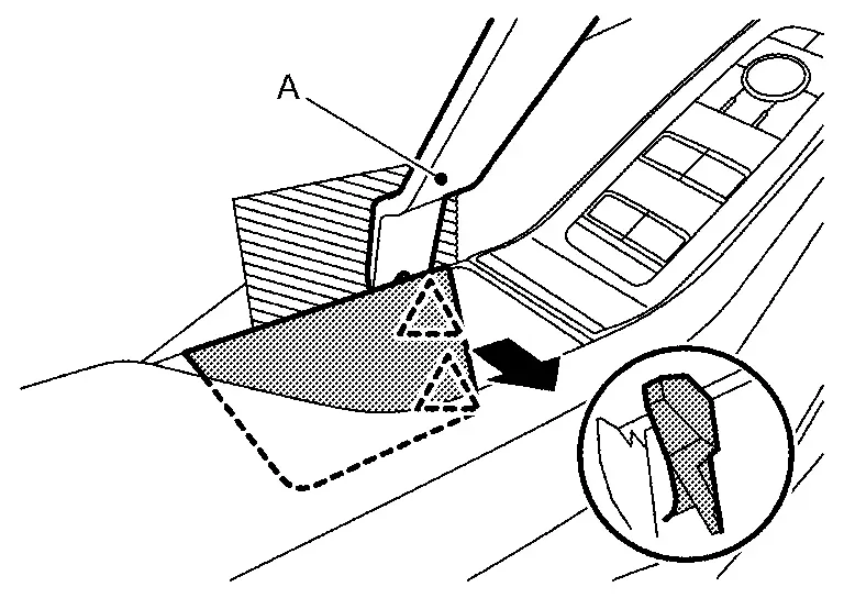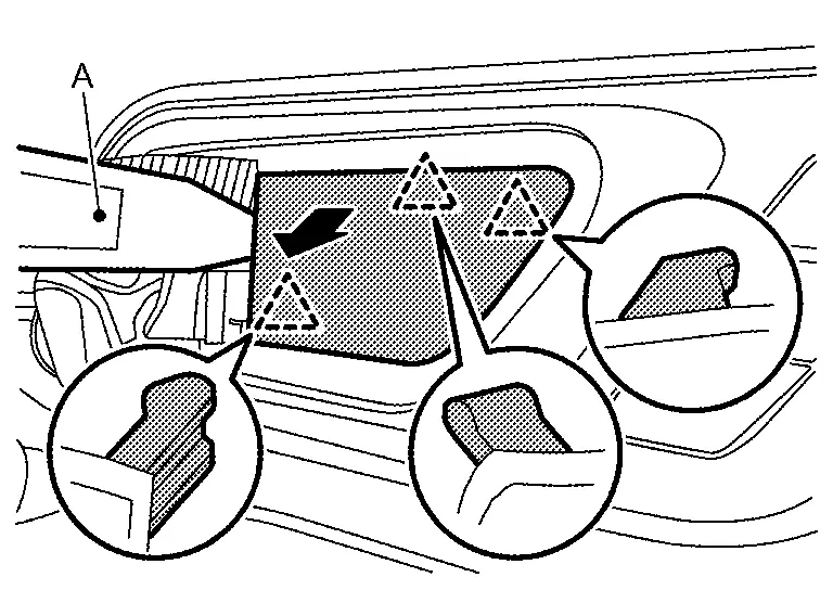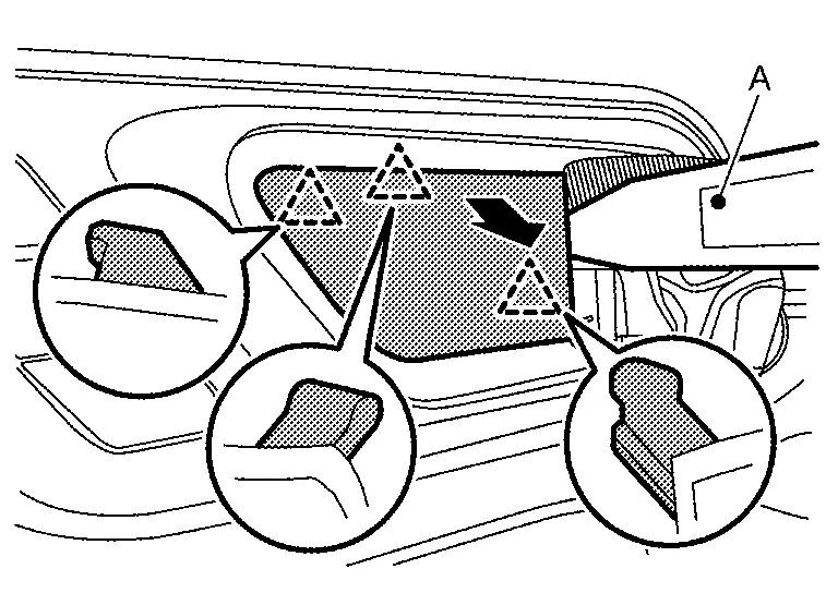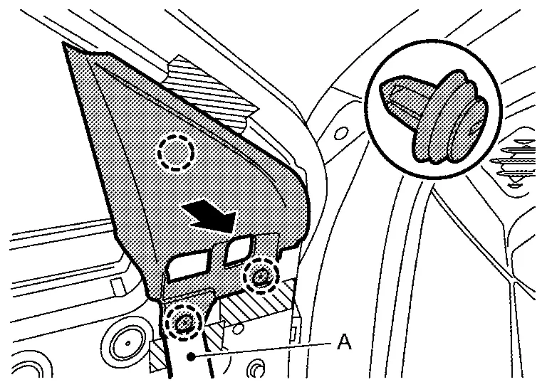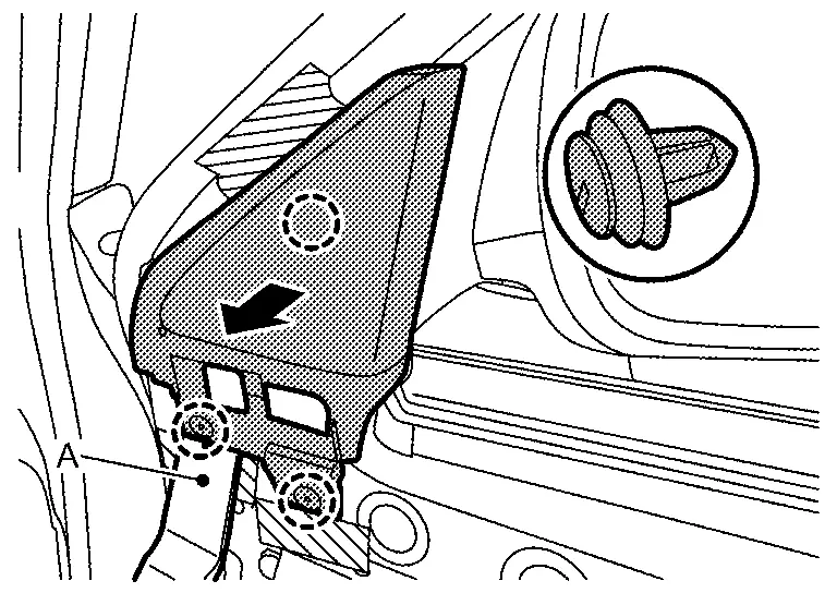 Disengage door corner cover fixing clips using a remover tool (A), and then remove door corner cover.