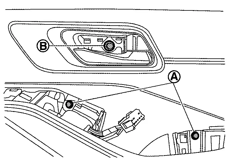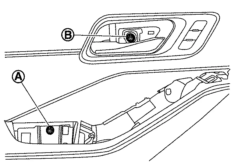 Remove front door finisher mounting screw (A) and mounting bolt (B).