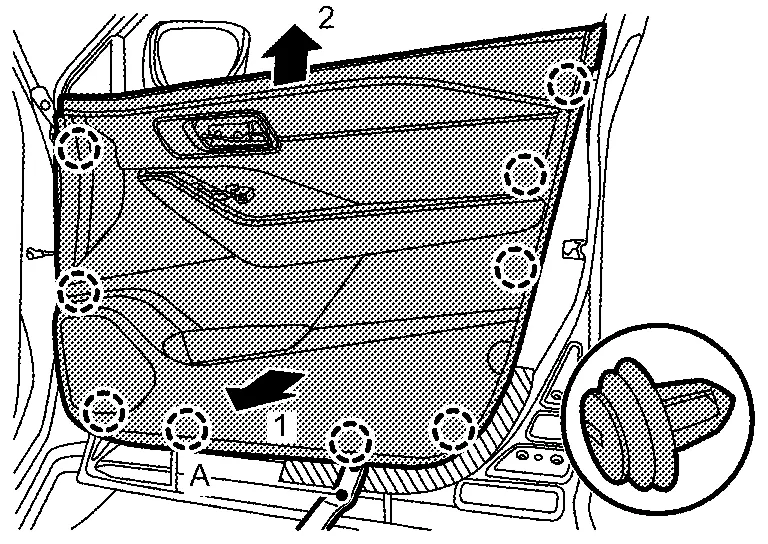 Disengage front door finisher fixing clips using a remover tool (A) according to numerical order 1→2 indicated by arrows as shown in the figure.