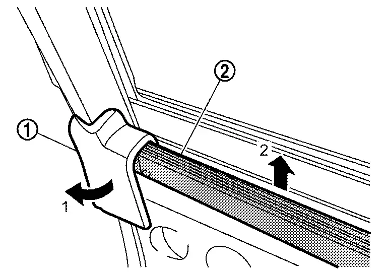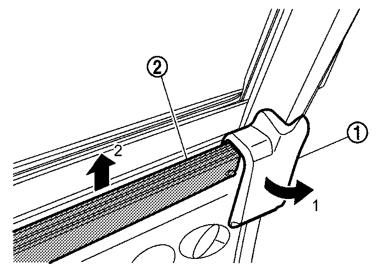 Disengage front door weather-strip (1), and then remove inside seal (2) according to numerical order 1→2 indicated by arrows as shown in the figure.