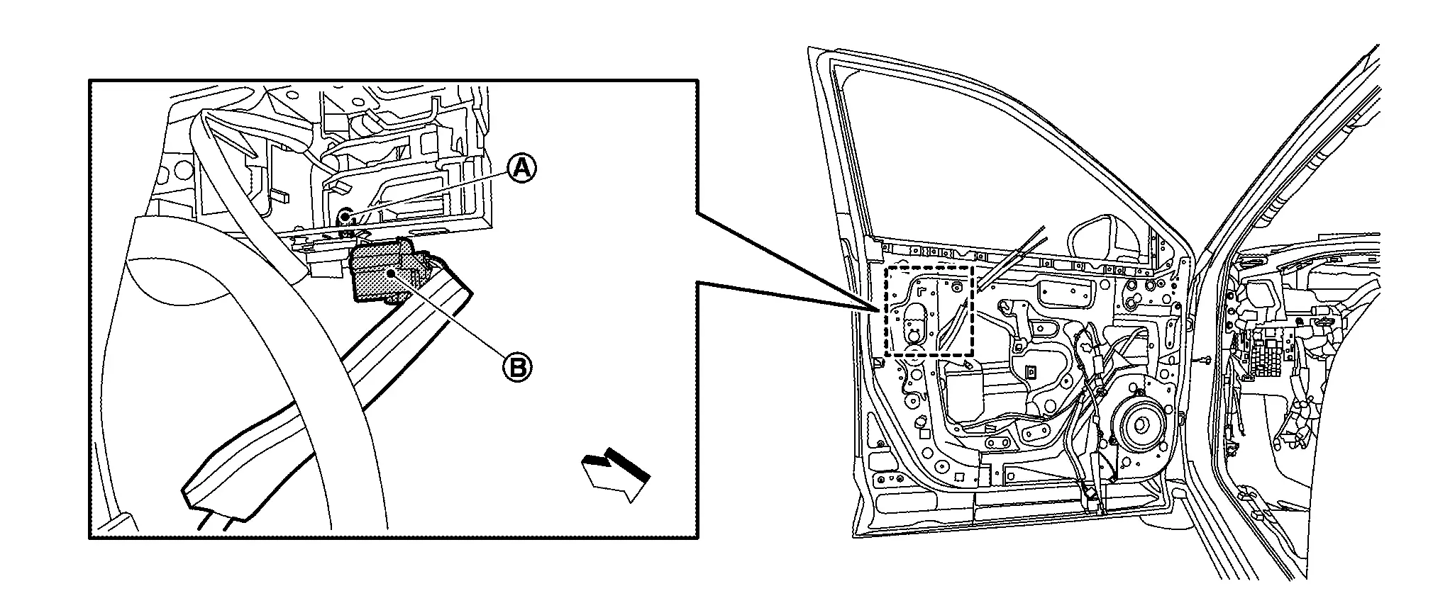 Remove front door finisher. Refer to Removal and Installation.